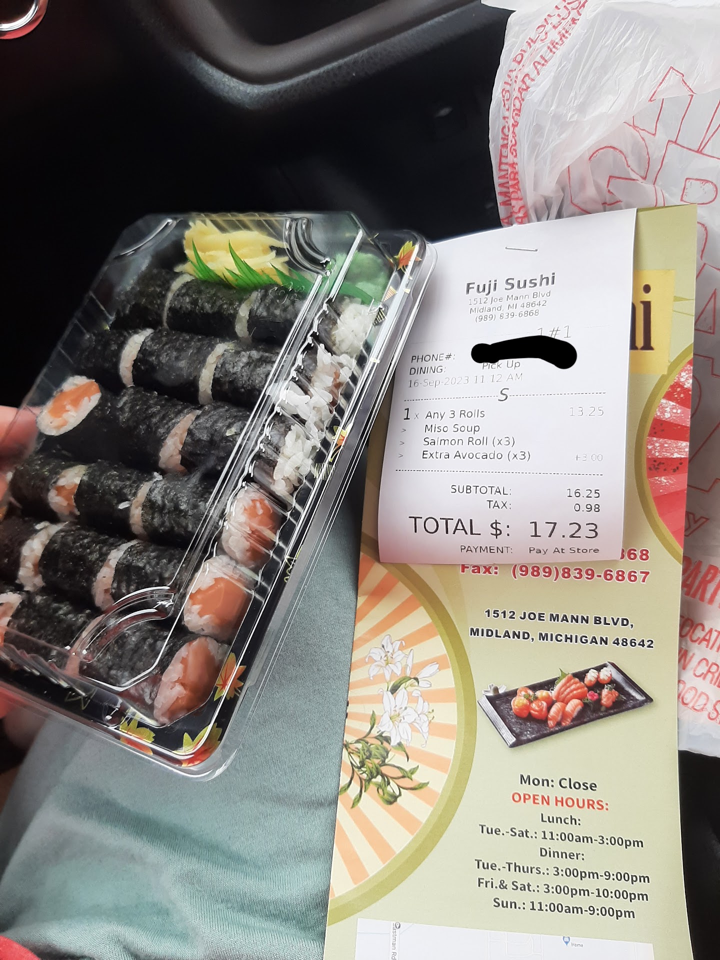 Read moreOrdered a lunch special takeout order, specifically asked for 3 salmon avocado rolls on the phone making sure that it was included in the lunch special r1-r7, guess what it is. 20 minutes into my drive to Frankfort MI I check on my takeout order and not only is my order wrong, I was given 3 salmon tekka maki, I was also charged $3 for avocado that surprise was not even included!