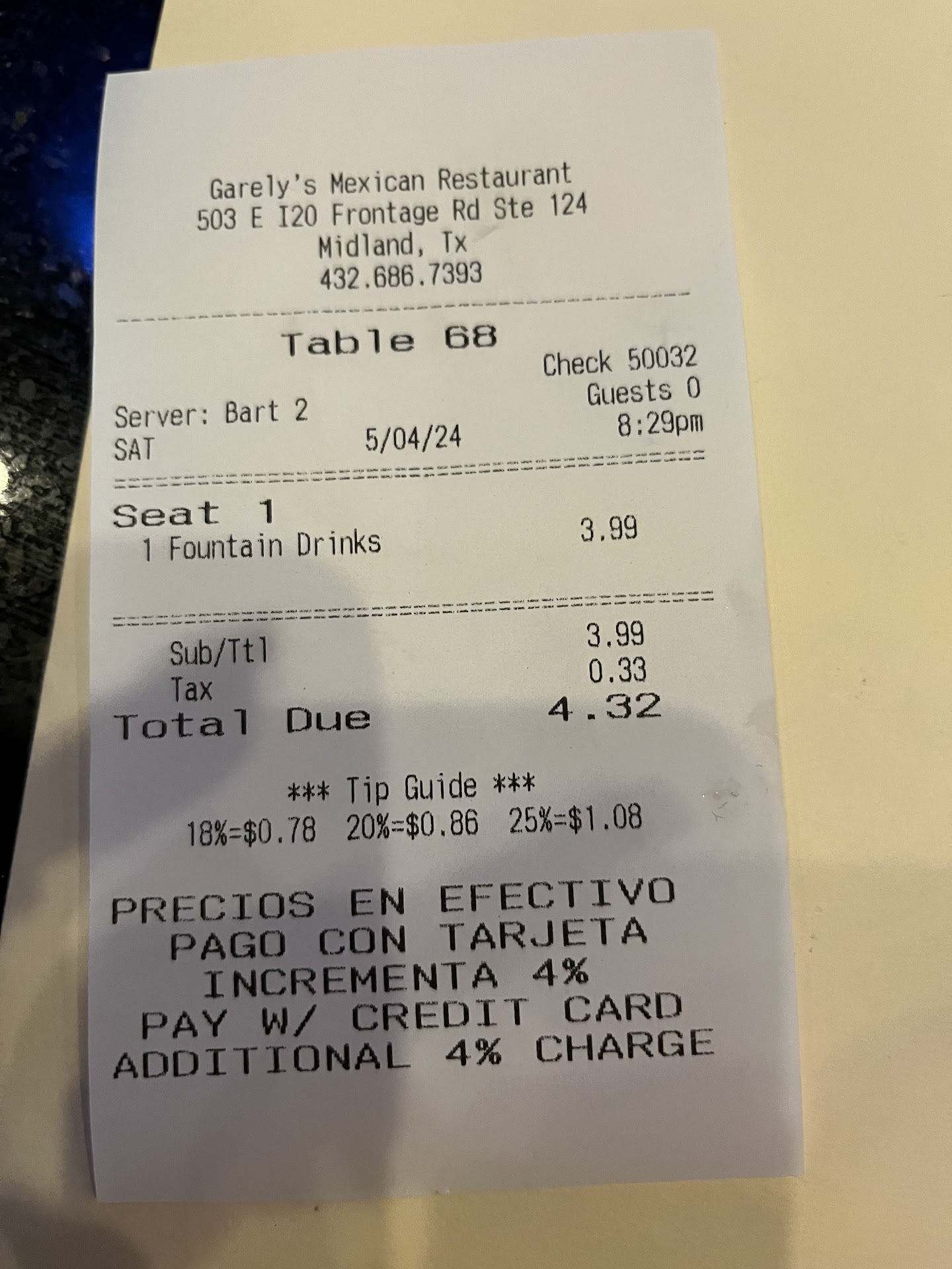 Read moreThis place and this experience us been the worst in ANY restaurant in Midland. Me and my family were sitting waiting for over 15 minutes until a waitress finally showed up to take our drink orders, we were ready to order so everybody order their meals, later again after another long waiting finally we had chips and salsa.....we were very hungry, no one went back to our table to at least let us know if our meals were taking longer, after 1 hour of waiting we all decided to leave, I asked another girl if they were having trouble in the kitchen with not enough people cooking then I spotted our waitress just standing there doing nothing, my son told me that she started laughing and making fun of us and she screamed at the kitchen crew to not to fix our meals...I don't think I will ever go there again, also I don't know why restaurants have their music so loud, we have to be screaming in order to have a conversation and everybody is screaming so as soon as you enter that place it's loud. We decided to go to Abuelo's and had our meals with a very professional and respectful service and in a matter of minutes we all were eating our meals. I have to rate this place and have to choose stars, they should have a zero to press because 1 star seems too much for a...