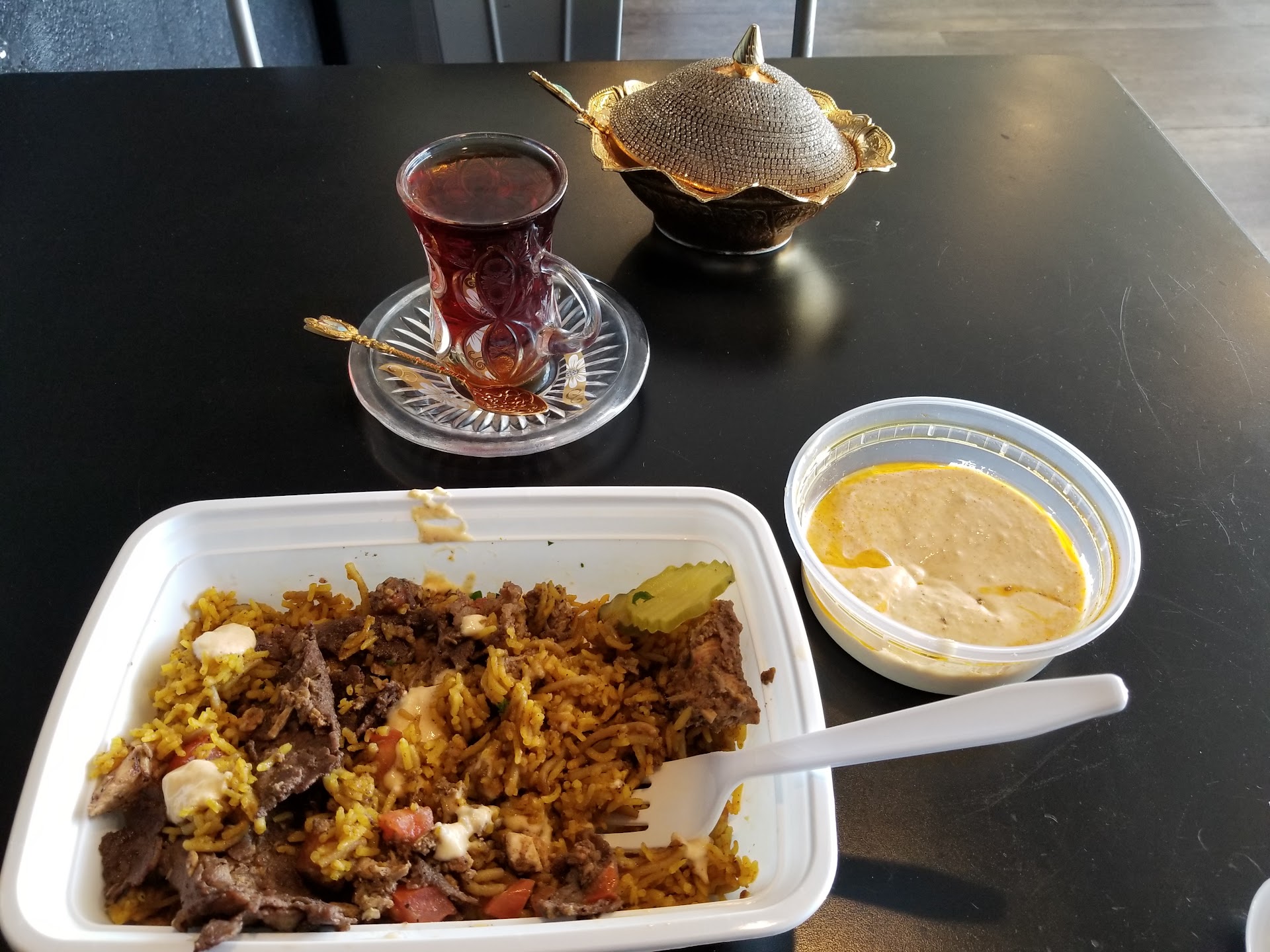 I ordered the Lamb Gyro over Saffron rice, with the side choice of hummus and a salad of Tabouli, and “Iraqi tea.”