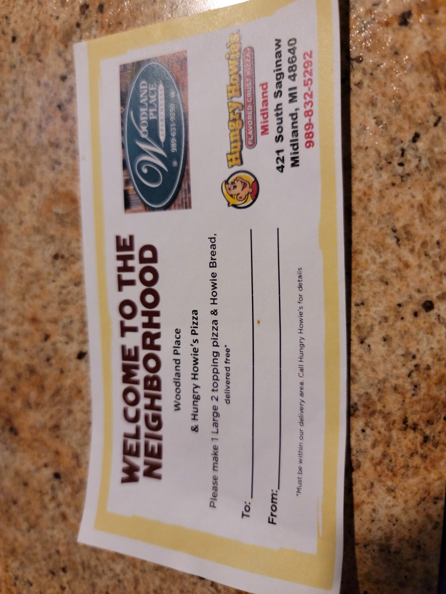 Read moreFriend moved to the midland area. Was presented with this coupon and was told it could be used for free delivery anywhere in the delivery range, not limited to woodland place. Attempted to use the coupon while said friend was at my house, and the hungry howies created the order. Then received a call 10 minutes later that the General Manager was denying the order because it wasn't going to woodland place. As you can see attached, the coupon does not state this anywhere. I guess the $10 worth of food was worth losing our business forever, as I will never think of hungry howies for my pizza needs in the future. I will also encourage all my friends and family to go elsewhere as well. That general manager forgot the #1 rule, please your customer base. Why hand out the coupon if you're not going to honor it? Seems pretty simple to me. Oh well, jets...