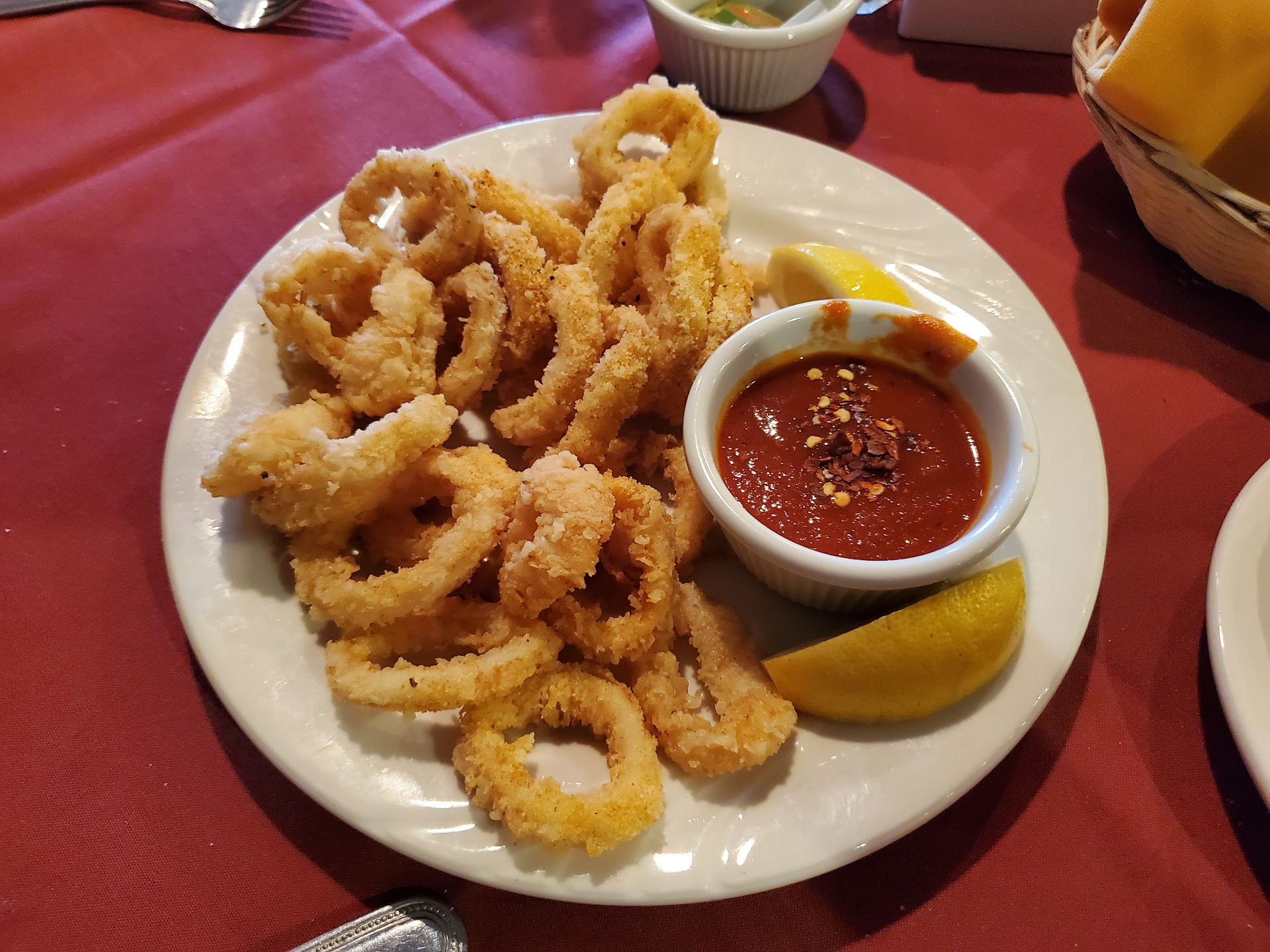 Our server was attentive and informed us of the daily dishes not on menu and we ordered fried calamari for the appetizer. The wife ordered a dish that comes with chicken and potatoes. I ordered the daily special which was red fish on a bed of linguini with muscles, shrimp, asparagus and tomatoes.