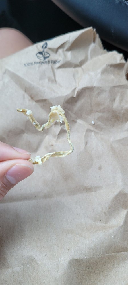 Read more6.13.21 Ordered a Bacon & Egg burrito and specifically asked for no cheese (I have stomach ulcers so any bit of dairy can be incredibly painful) . Ofcourse, they put cheese on it so I go back and ask for another burrito and made it clear that I didn't want cheese on, that I had just ordered one the same way and it came out with cheese. The guy at the drive thru window didn't care much for the issue or my concerns. I got my second order without cheese but as I was finishing up...I find this in my burrito...can officially say I AM DONE WITH THEM! WORST EXPERIENCE EVER. Better off making my own...