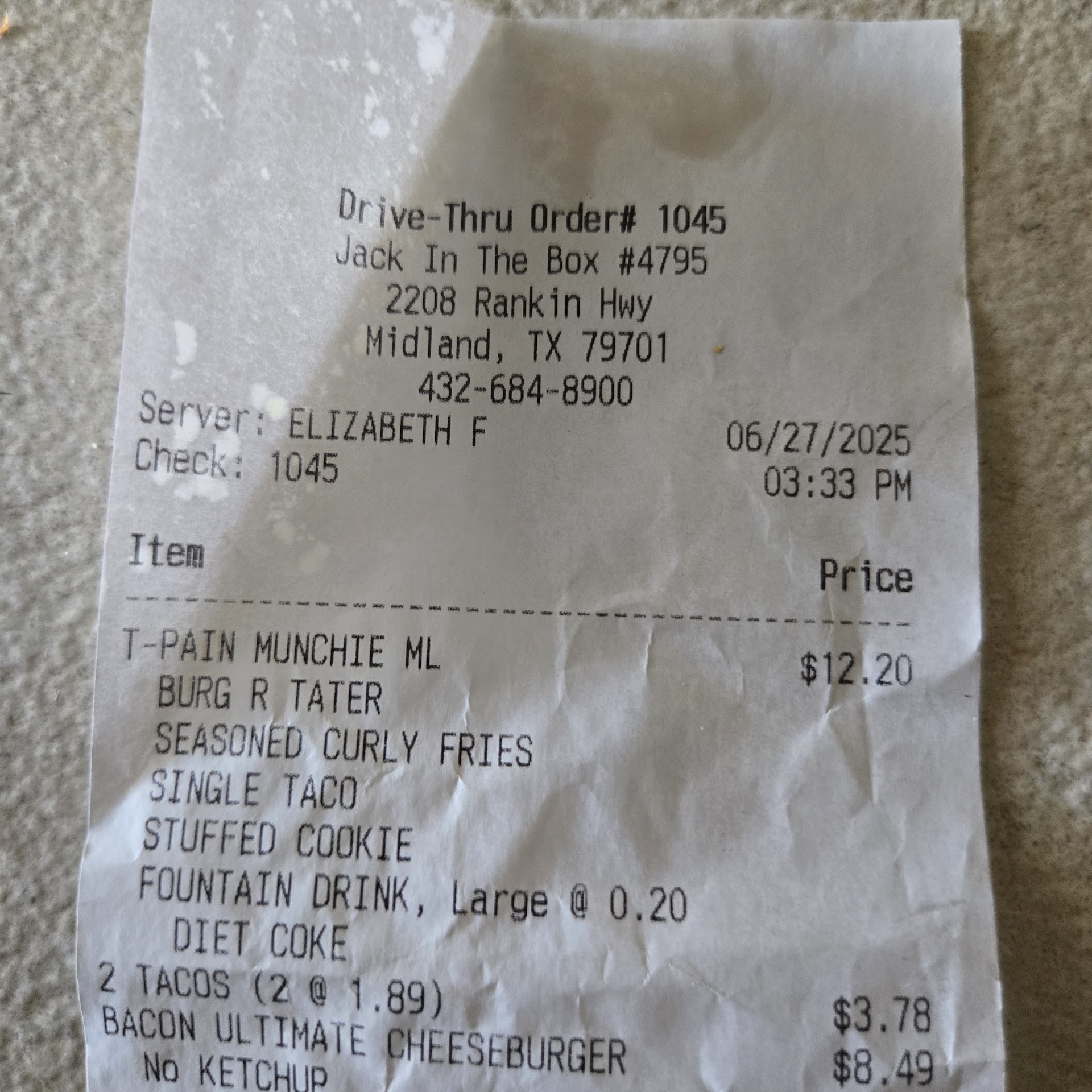 Read moreJust ordered through the drive-trhough. Ordered a Build Your Own Ultimate Munchies with an Ultimate Cheeseburger, 4 tacos and a large drink and then an Ultimate Bacon Cheeseburger and a medium fries. When I got to the pick up windows and paid for my order I found out they charged me for the T-Pain Munchie Meal, 2 tacos, and my bacon cheeseburger and fries. I tried to tell the person that my order was wrong but he had trouble understanding me as English is not his native language. I had to show him his own website and point to what I ordered. Then I asked him to make sure that my Ultimate Bacon cheeseburger was plain and dry. No mustard no ketchup no pickles. Just burger cheese and bacon. He said OK. Waited another 3 minutes at the pickup window then he told me to park in front to wait for my order. 15 minutes later he brought me 1 bag. I asked him where the other half of my order was. He said "Oh." I checked the bag he gave me and it was incorrect. There was a Ultimate burger, curly fries and 2 tacos. I told him when he came back out that it should be burger and 4 tacos. He took the bag back inside as he handed my my 2nd burger. Which was completely wrong. I ordered it plain and dry. This had everything on it. So I followed him in explaining what plain and dry means. No mustard no mayo no ketchup no pickles. Just meat and cheese and bacon. He looked at me like he never heard about anyone ever ordering like this. He asked his cook to remake the burger.