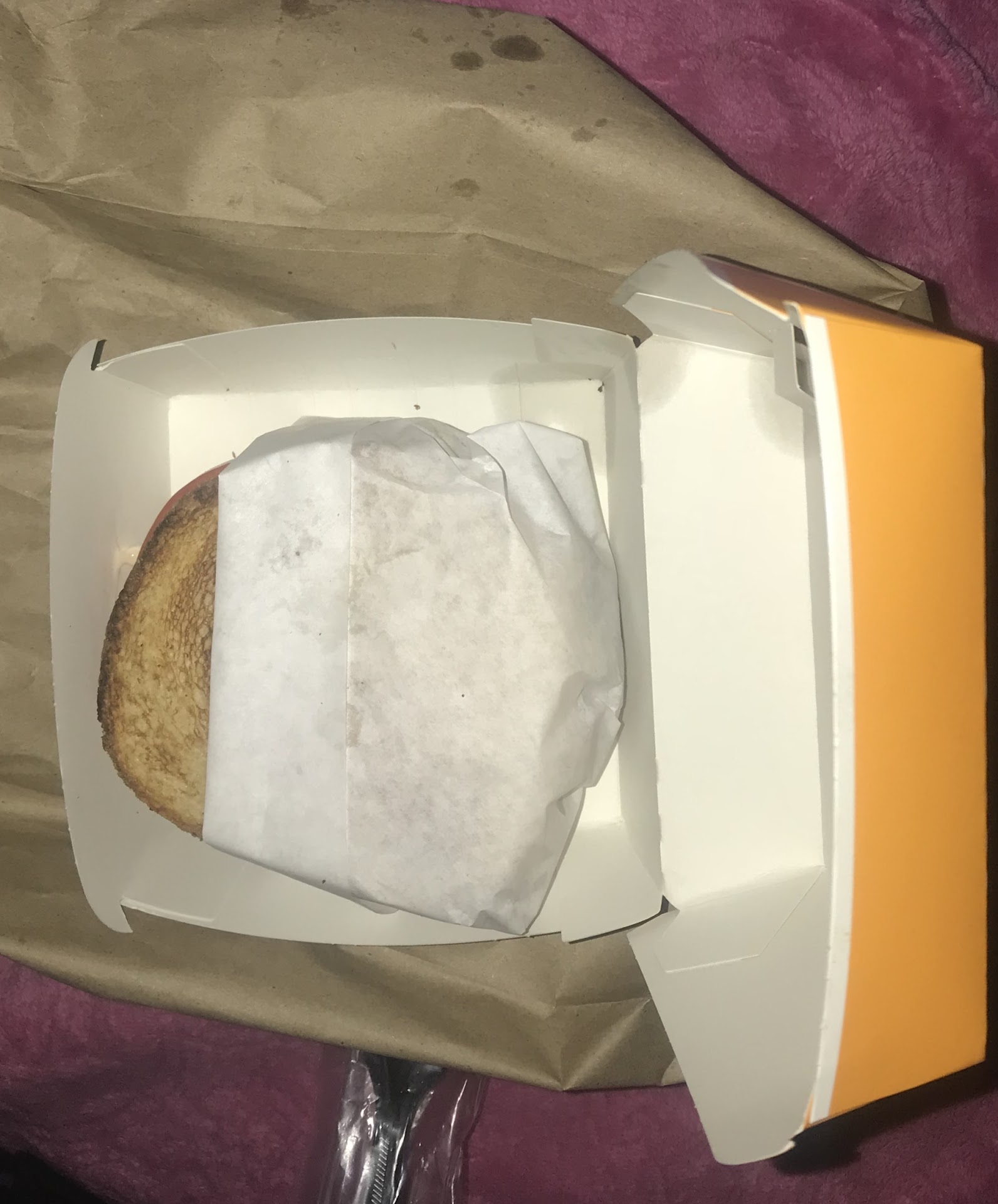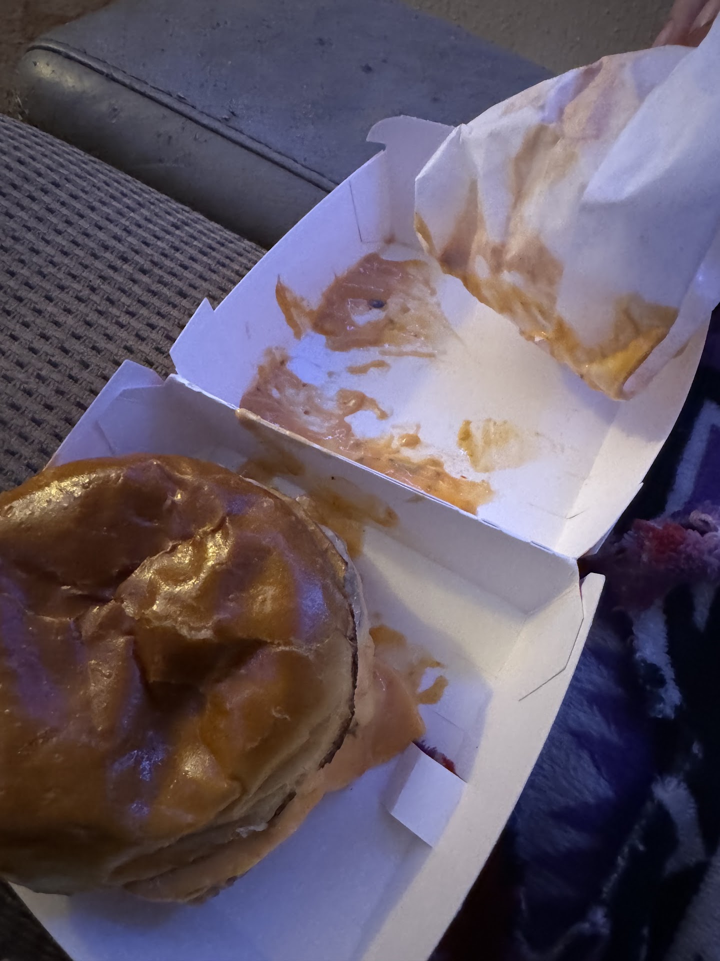 I get home and hand my mother her Munchies order. Her burger is plain and dry with just a little bit of mustard and ketchup on the bun. The tacos were swimming in burnt grease. Half the taco shells were wet and darker brown than the top of the tacos. Completely inedible.