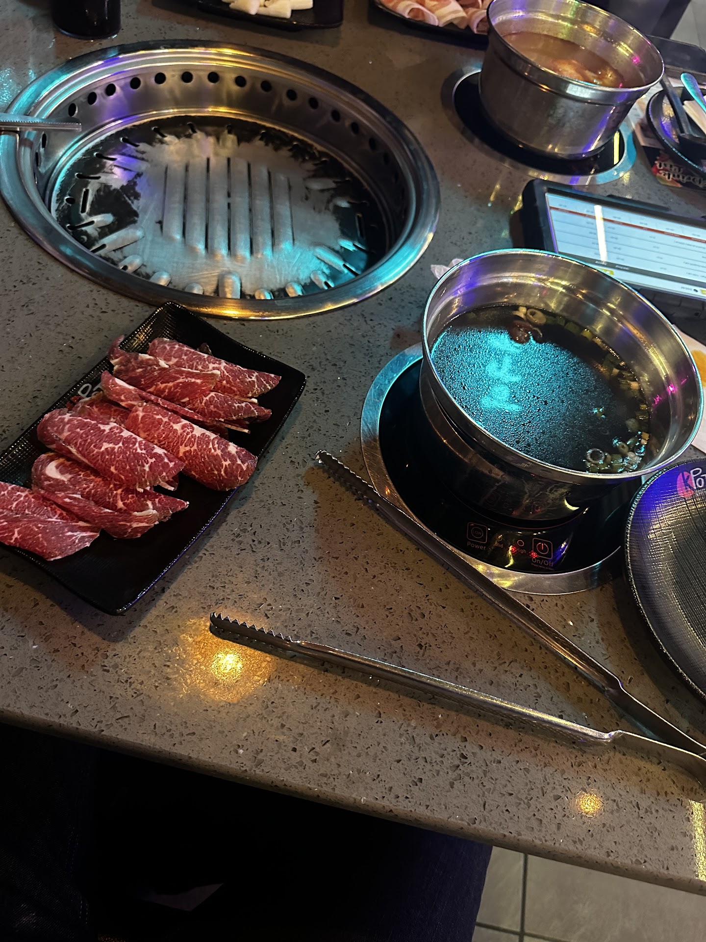 My husband and I went to KPot for the first time last night without our kids. Iâve been wanting to try it, he was not as enthusiastic. Turns out, he was right. There was no wait for us when we went in and they asked if it was our first time and we said yes. They stamped âFirst Timeâ on the paper and we were promptly sat. I was like, oh good, they do the first time stamp so our server can guide us. I was already intimidated, I tried to âstudyâ before going and thereâs just so much info, that I got even more overwhelmed. I was was a little more at ease with that stamp. Our server basically said, âjust have funâ handed me the tablet and said, send your order to the kitchen when you are done. Like what? Can you guide me? Give me some pointers? HELP! All he suggested was to try both since it was our first time, but donât order too much or we will charge you for food waste. So I was terrified to order thinking, is this too much? We got our order submitted and went to the sauce bar where several things were not labeled and we sat down and waited. Thatâs when it became chaotic. They bring your food out on carts, oh, but itâs not at once. They will drop off a random raw meat, no labels, you have no clue what it is, so you have to get back on the tablet to try to find the picture to see if it matches. Then they will bring a couple of more plates of meat, again, no labels. They have other tables orders on the cart as well, so itâs literally a drive by and they are gone before you can ask. They had all of our hot pot ingredients on the table for 20 minutes, no broth, while all the tables that sat down after us were already cooking all of their foods, hot pot and bbq. No drinks at our table, that took 20 minutes too. Our server was so absent that several people stopped and asked if weâd seen our server yet. And when we got our bill, it was $94 for a sweet tea, a soda and 2 hot pots and bbqâs. Like what??? It was not an enjoyable experience. They crowd your table with all the plates, you barely have room to move and if a dude named Aaron is your server, he wonât be at your table often and he wonât offer any help whether itâs cooking tips or ordering. Use your $100 elsewhere and enjoy a night out at a nicer restaurant. I get it, itâs for the experience, but when your experience is not a good one, it sucks. Our server told us in the beginning, âI know youâll be backâ, no, no we wonât. The $100 we spent there and the $60 we spent for our kids to be taken care of so we could enjoy a rare night out, could have been spent...
