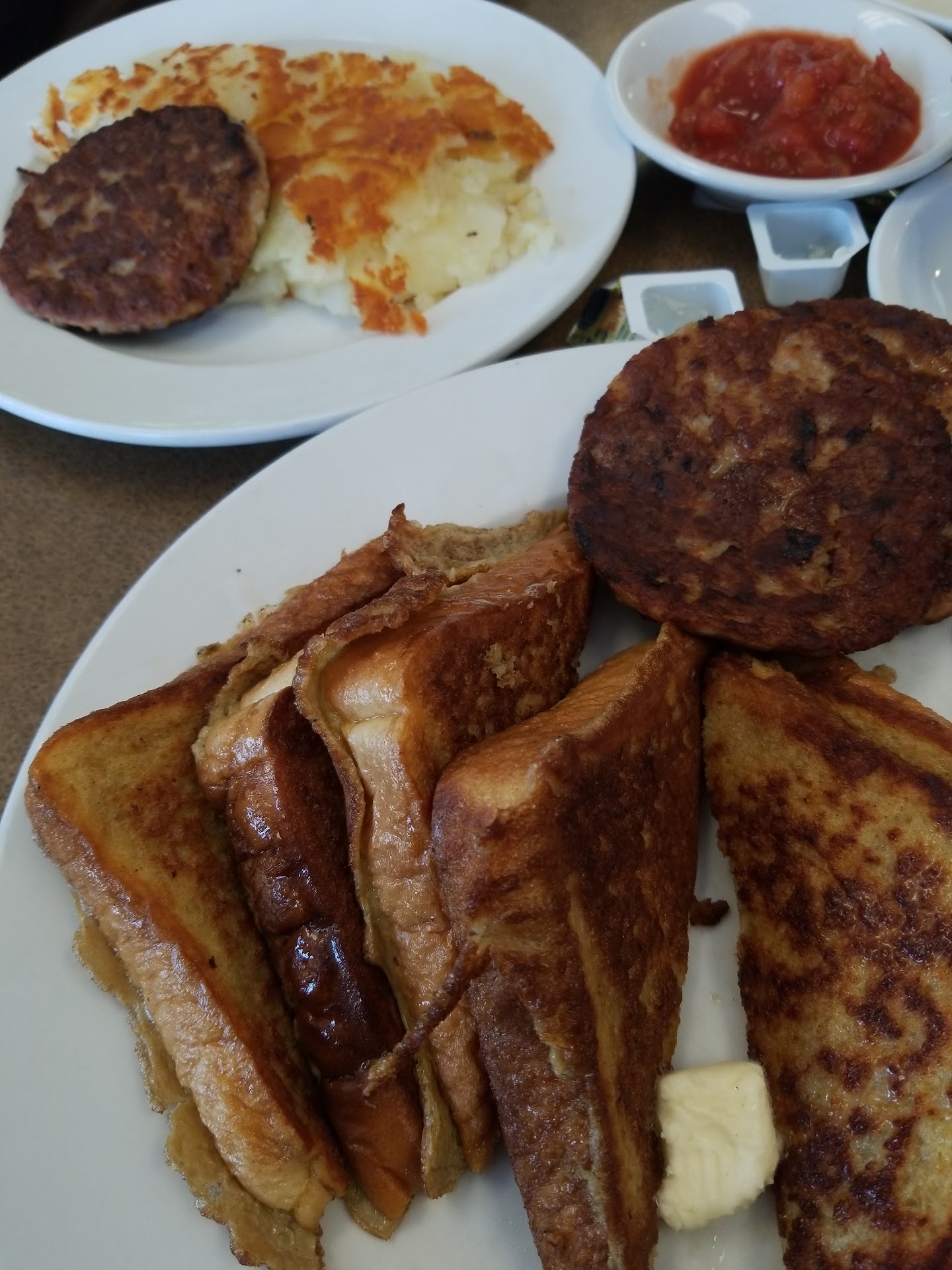 I ordered the French toast with a side of sausage and hubby ordered the piggy omelette. Both were delicious and very large portions! The side of sausage comes with three patties and the French toast has six half slices of bread!
