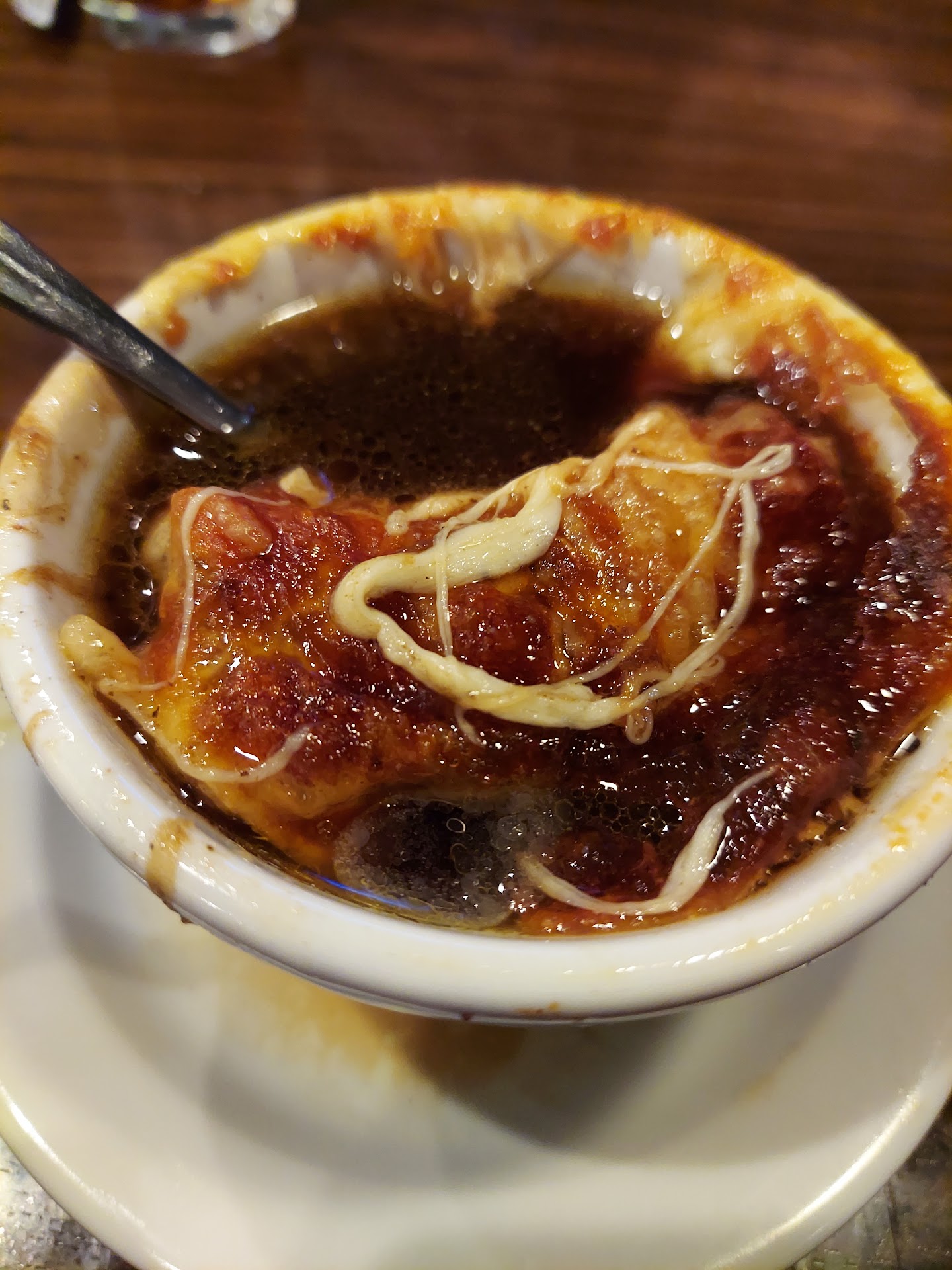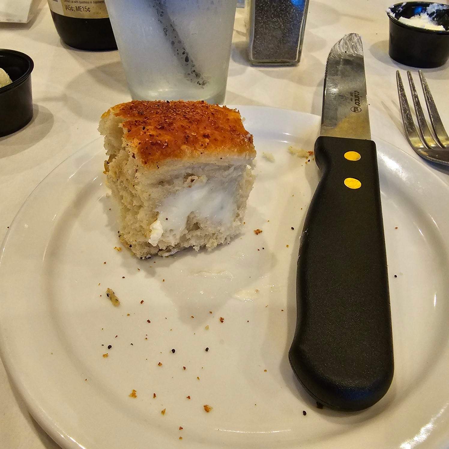 Read moreWe had just a party of three of us so seating was not any problem, although I asked if we could get a table in the back, not a problem there either. I felt the atmosphere to be nice and a bit upscale, it made me feel at ease, not too bright and the ambiance was soothing. I thought the floors were just fine and my shoes did not stick to the floor as another patron complained about. To my eyes everything looked clean. Upon arriving at our table we were greeted by our server and supplied with the most amazing fresh loaf of warm bread inside a white paper sleeve and tiny black plastic cups that contained whipped butter with a hint of garlic. This whipped butter I’d like to know how to make it, it was super light and yummy. The white bread was incredibly fluffy, warm and delicate which had a nicely browned top crust with a slightly salty garlicky top crust that was so good that we bought two loaves to take home. The bread alone was worth the experience and even if I had ordered just soup and this bread would have sufficed for me in itself. I chose the French onion soup which was pretty good but the broth could have been a bit thicker and although was good it did slightly lack in flavor but I would get this again next time I go in Lou of the salad nonetheless. Our entrees included prime rib, sirloin steak, and filet mignon medallions. My husband did like his steak cooked medium and it was cooked to his liking but it had a bit of gristle but the flavor was there. The same for my mignon’s, a bit of gristle but I ordered them medium rare, they were cooked just as I ordered. I felt the flavor was terrific and there were four small pieces that were more than enough for myself but I eat light. I took home leftovers and upon reheating the mignon’s were even better! My son liked the prime rib but I think he was up in the air about it really. All of us had enough leftovers to take home, they serve an ample amount of food, which is great. We left a generous tip to our server, she did a nice job and was attentive and but not overbearing and THANKFULLY did NOT address us as “honey” “darlin” “sweetheart” etc as these wait staff now days needs coaching on what not to say! Our overall experience was real nice and we plan to go back to...