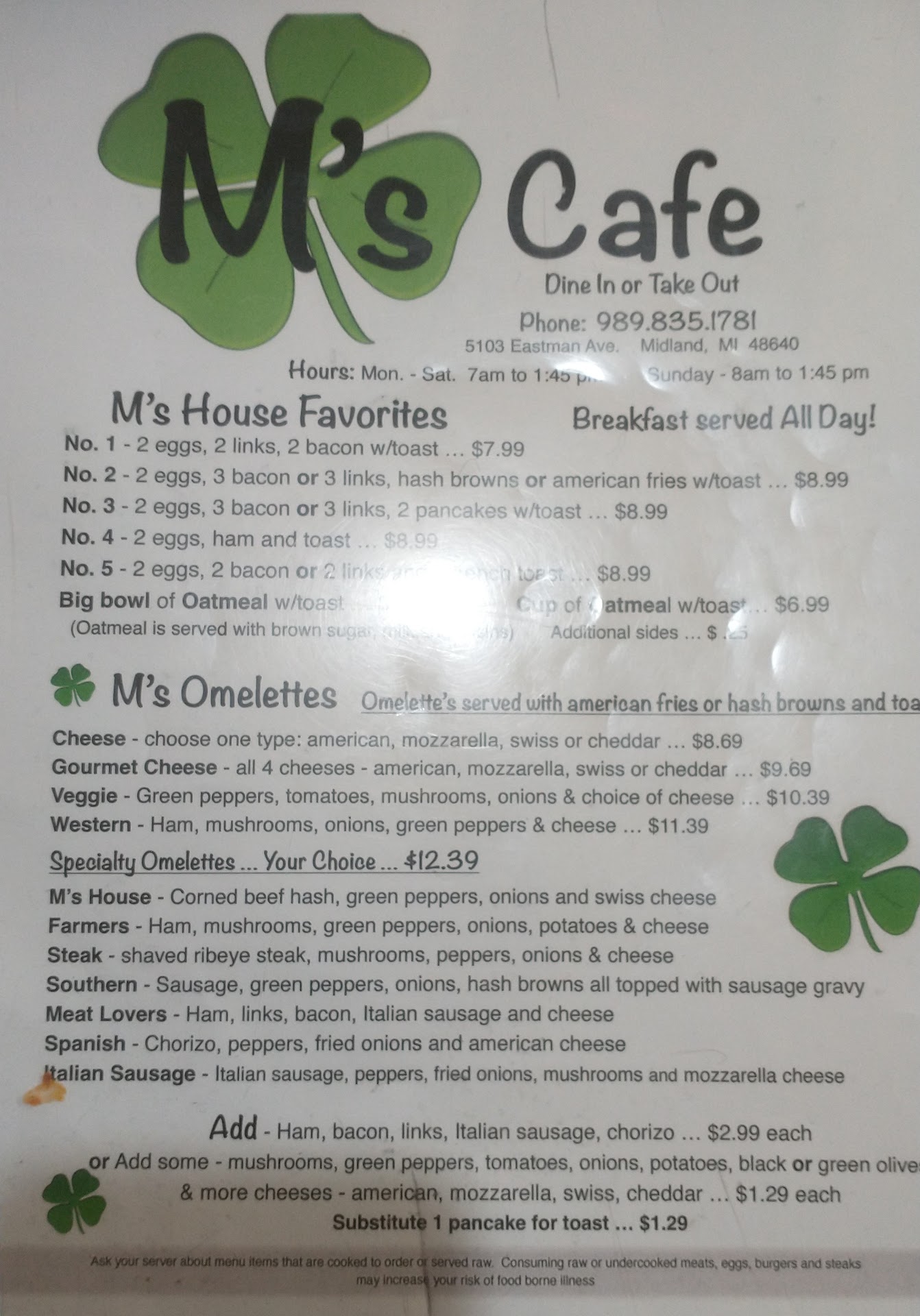 Read moreI was very disappointed with M's. We arrived before peak Sunday breakfast hour and seated ourselves. It took a long time for anyone to even acknowledge our presence as they refilled everyone in the restaurant's coffee before getting around to greeting us. I ordered a special with corned beef hash and was sorely disappointed; they use canned corned beef which was hard for me to stomach. None of our eggs were cooked as ordered, and our server didn't return to our table soon enough for any of us to want to bother asking for them to be re-done. The biscuits were overdone and hard to eat.