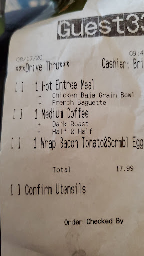 Read moreWe went through the drive through at 9:49 AM. We ordered the Baja grain bowl, a bacon, tomato & scrambled egg wrap, and coffee. The bread surrounding the wrap was cracker hard in several places, all the tomatoes were on the top of the wrap, and all the bacon was on the bottom.🤔 The grain bowl was very tasty, eventhough it seemed a bit sparse. The coffee was delicious, and piping hot! Unfortunately, I didn't notice that the baguette was missing from the bag until we were long gone from the drive through...bummer! I do really enjoy the various breads Panera makes, especially early in the day when they're fresh. 🙁 Usually Panera has generous portions, great food, beverages, and of course, fresh bread. Maybe we just caught this store at a bad time, or...who knows. When you pay almost $18 for drive through food, I guess you just hope for better than...