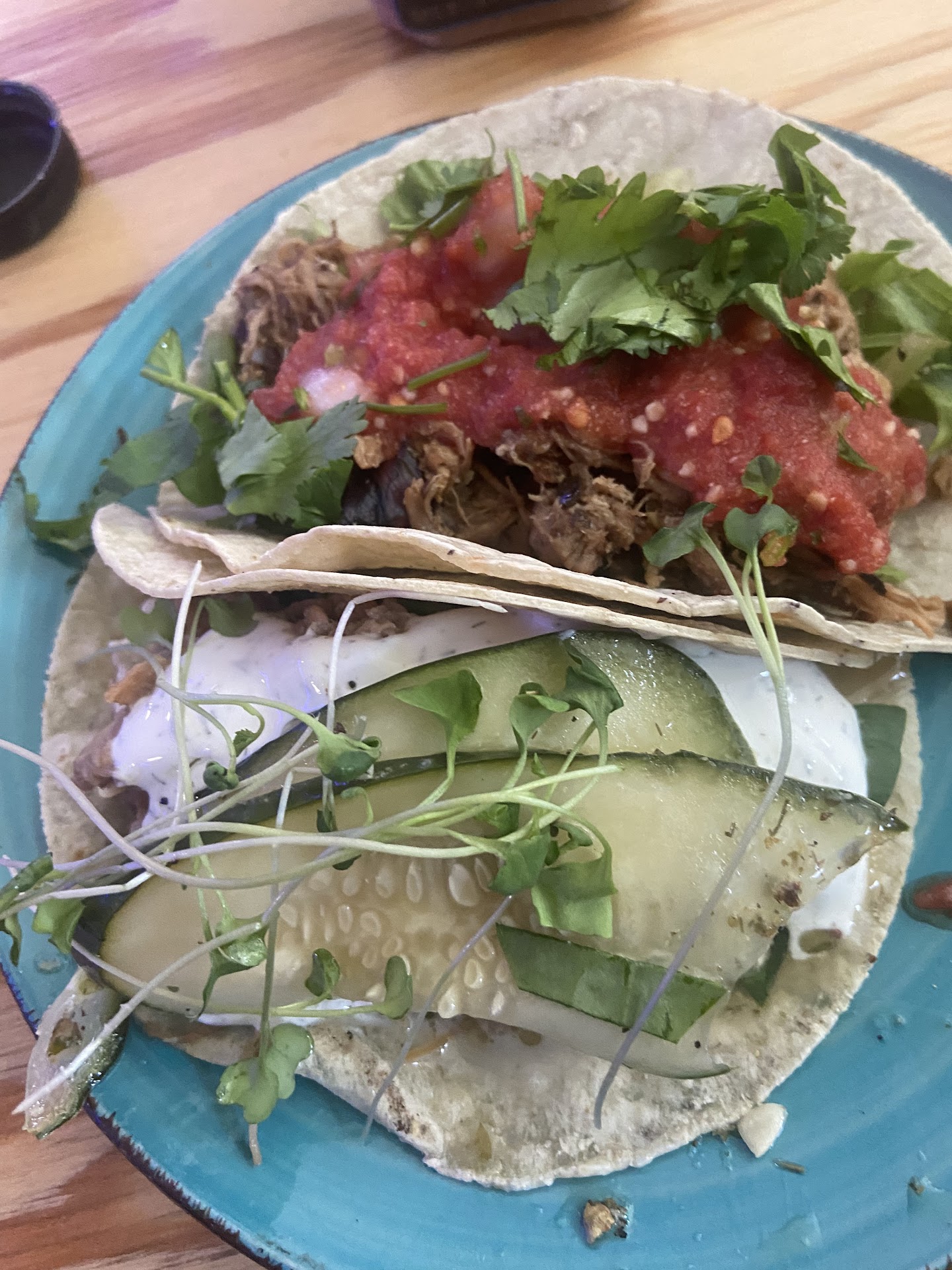 Creative tacos, not your normal taqueria. Cute little place. The menu is a bit overwhelming, thankfully the guy gave us a menu tour which did help but it was still overwhelming. Iām glad I looked online first because I kind of knew what I wanted to get. You walk up to a counter to order. The menu is on the wall. Tbh this makes it very overwhelming with a menu that has so many options and variations it would be better done as an in hand menu. After ordering I heard the workers talking in the back about how they canāt understand how someone, even after the menu has been explained to them that they canāt figure out what to order. I can tell you right now that it is the way that the menu is presented. Itās the names and the way the ingredients are listed. Having the spicy items listed in red helped my guy order because he knew which items he wanted immediately. I on the other hand needed to read the overwhelming list of ingredients. The smell when I walked in was a bit sour and there were a few flies around the kitchen and counter area which was off putting. The flies and overwhelming menu almost made me want to leave. I ended up getting an Odin and a Becky- both were super wet with the water from the bin the chicken was pulled from. They definitely need a spoodle. Because they are not draining their scoops. My tacos were so soggy and wet that it was a mess to eat. My first bite of the Odin got all over me and the table. While the flavor and presentation were good the actuality of the taco was a disaster. The last plate photo in my post shows the liquid that came out of both my tacos. My guys tacos were different meats than mine so he didnāt have my issue. He had the moe and the Amanda. He said the moe was interesting and the Amanda was best. We had the Nathan to share which was really good. The worker never checked up on us or pre-bussed our table but did it for a family that sat next to us. This was upsetting. I was gonna talk to them about my experience but figured after hearing them talk about the customers before hand and the fact that they didnāt check up on us that they probably didnāt care. Good not great....