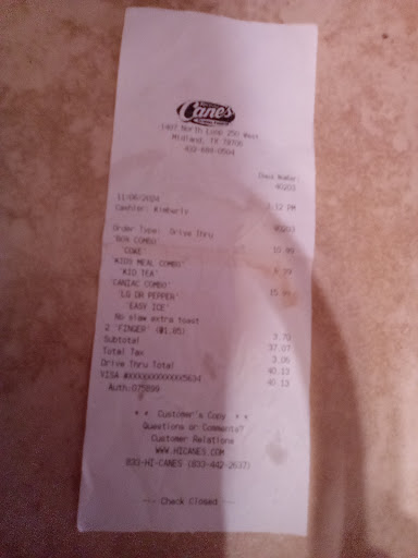 Ā Ā Ā Read moreThis is the closest location to my house, unfortunately every time I come here without fail either something snarky is said to me or between the kitchen staff and employee taking my order or Iām given a off putting look (eye roll, etc) and I leave feeling like a burden to the employees that take my order. I always come in with a kind demeanor and thank everyone I come into contact with. Aside from a normal order I add three simple modifications to my order. As a service industry fine dining server with a decade of experience it always rubs me the wrong way as I used to serve 6-10 course dinner services to celebrities. I always go above and beyond to be kind and provide good service and I do not feel like this canes provides the same. I only eat fast food once a month and overall itās a disappointing experience. Even when I order fries extra crispy you can tell theyāre either not thrown in again or rushed. For 20$ a pop we should get what we ask for. Iāve began driving further to the other midland canes, never have bad attitudes and good always comes out correct...