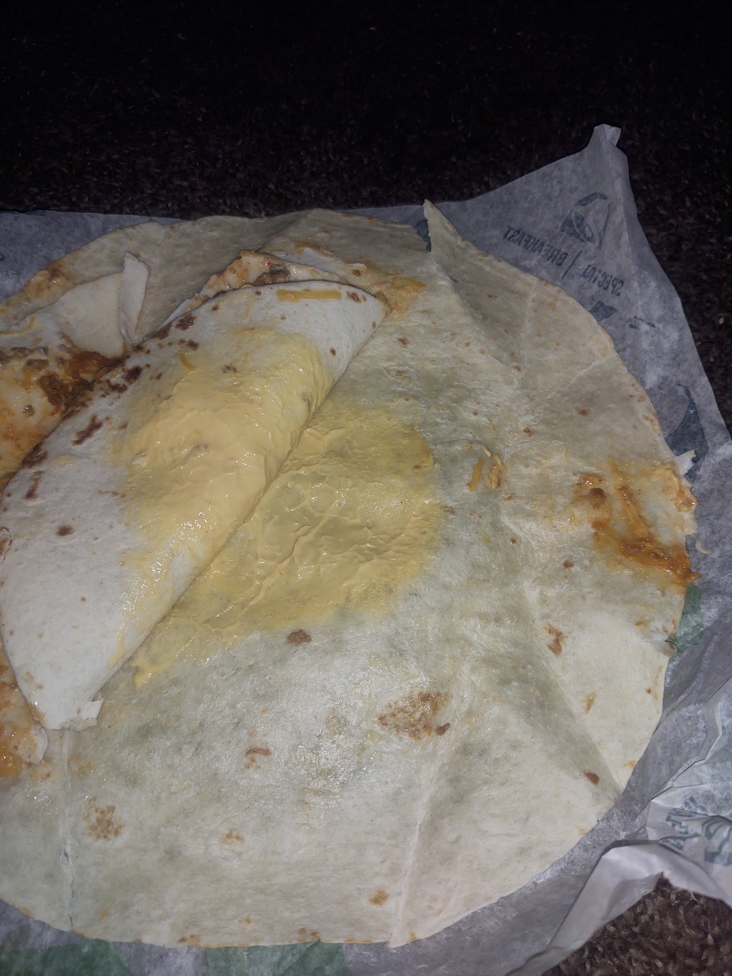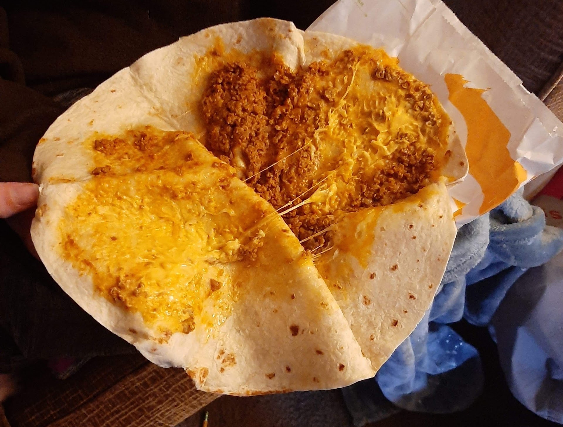 Read moreWent to get lunch today on my break, got the cheezit combo with the nacho fries, Crunchwrap beefy 5 layer and large fountain pop, my boyfriend got the grilled cheese burrito combo and added extra steak and jalapeños, which we paid extra for. The Crunchwrap was literally FALLING APART the tortilla was raw, and not closed it looks like it was on the press for all of 5 seconds, I used to work at Moes where we made stacks, I know it takes at least 30 seconds-1 minute to properly close those crunchwraps, the tomatoes on it were squishy and obviously extremely old, it looked like someone had squeezed the crunchwrap with how it looked, the beefy 5 layer tortilla was also raw, it was also the smallest beefy 5 layer I’ve ever seen, the fries were soggy and my nacho cheese was so hot it actually melted the portion cup it was served in. The grilled cheese burrito had a hole in the top of it the size of someone’s finger, it also had no jalapeños and no extra beef, it was also one of the smallest grilled cheese burritos I’ve ever seen, it was smaller than a beefy 5 layer, which you’d think if we paid extra for the extra steak and jalapeños they’d put it on there, looks like they were short some braincells today because the person who handed us the bag looked completely stoned, the hard shell taco also came broken. 25$ worth of food, and shitty service. Thank you for listening to my Ted talk. Update: currently pooping my brains out from the rotten tomatoes. Thanks for the...