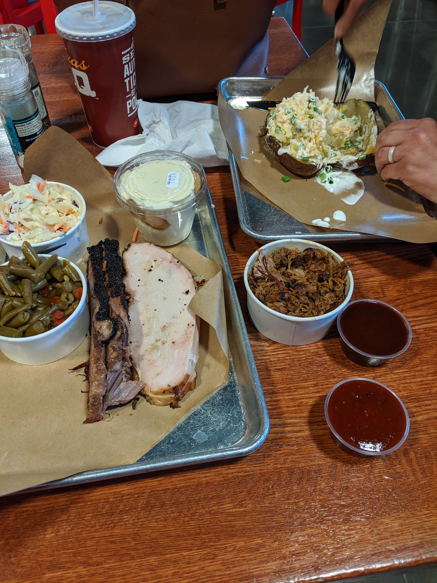 Read moreWell I have to say I'm really impressed with this BBQ place. I was told it could get pretty busy at dinner the so I went at 0530pm to beat the rush. It worked because there was a descent line when I left a quarter past 6. The ladies at the register and pick window were very nice so great customer service. I ordered the 3 meat platter and paid extra for the ribs. This 3 meat combo came with 2 sides, bread, pickles and onions. It was enough food for two people but I attempted to tackle it on my own. The mac and cheese was really delicious. Good cheese flavor and good texture on the Mac. Will definitely get it again. I also had the brisket beans and they also tasted great. The base had great flavor with a little kick. The beans were cooked well and the brisket really made the flavor pop. I was lucky enough to get a couple pieces of fatty brisket and they really soaked the flavor up. Delicious! The fatty brisket was great with a nice bark and great smoked flavor. It also had a very nice smoke ring. The pulled pork had a nice crispy texture to it without being dry. Went well with the peppered BBQ sauce. The ribs were my favorite though, great smoky flavor that went all the way through, nice crispy bark on the outside and fall off the bone tender on the inside. They were perfect. Glad I decided to stop by. I'm not a local but my local HEB north of Houston has a true Texas that I never tried. Will have to take the family to the local one so they can try it out. Hopefully they have the Tuesday $1 pint night like this one does. I went on a Wednesday so no dollar beer for me. Wonk wonk. They do have trivia on Wednesday though. This may be my go to place when...