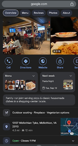 Ā Ā Ā Read more#1 Italian Spot in RVA at this price point. This 30+ year, family owned business wholistically captures the warmth of eating in Italy at your families Villa. Large portion, tasty food, with amazing dessert (better than we had in Italy) and a great wine selection. The atmosphere is nicely appointed with murals of the families history everywhere.