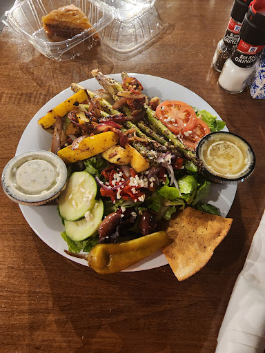 This was my first visit. I ordered the Greek salad with salmon. The food was absolutely delicious. The salmon was so flavorful and moist. I don't even like olives bit they one in my salad was delicious. The only down side was that my salad was supposed to have olives and pita chips with it but it only had 1 olive and 1 pita chip. Other than that, it was great. My husband ordered the vegetarian gyro. His came with potato chips and a tomato and cucumber salad. He said his food was delicious as well. The guy who took our order did forget to ask us what sides we wanted but he rectified that by coming to our table. The restaurant was clean. I could see what chefs coming right in the front of the restaurant and they seemed to have a great head chef who was spurring them on to complete orders quickly. I'm difficult to please at restaurants but this place definitely made me happy. The meal cost $24 for to people to eat and it's totally worth the cost due to the great tasting food. I will definitely return here when I'm in the...