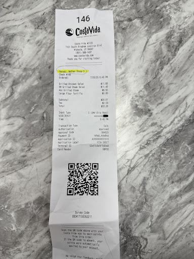 I hate to do this because I have had siblings who worked at Costa Vida for years and I know how hard each location works to give their customers great service and a great meal. This location seemed to lack some of the hard work and precision that I know to be very customary to Costa Vida. Let me first just say that I chose this location because of the drive thru- I have a toddler and it makes it MUCH more convenient to order and not have to chase him around inside if we are getting our food to-go. The drive thru was not open š but we went inside anyway. It was about 5:45 on a Saturday evening and there was no line and I waited there for several minutes with several employees walking right past me without saying a word or asking if I had been helped. Finally, I ordered shrimp tacos and a quesadilla kids meal for my son and everything seemed to be going just fine until I reached the checkout. I had also informed the employee at the checkout that I had a survey code for a free chips & salsa with my purchase. I love giving good reviews to people who provide good food and service. I got to the register and the employee said my total was over $22 š³ Iām not a mathematician, but I quickly calculated my meal to be around $10 (shrimp tacos) and my sons kids meal to be $4.. plus a couple dollars for tax. I asked them to make sure they didnāt charge me for chips & salsa because I gave them the code and then the employee said āoh yeahā and my new total was still almost $20. I couldnāt figure out how it cost so much so I asked again why it was that expensive and the employee proceeded to tell me that my sonās quesadilla DOESNāT come with rice and beans and that it costs extra. I felt so frustrated because Iāve never been told that and I wasnāt informed that when the food was being put together. Honestly, I didnāt want to cause a fuss because I had already asked them to clarify my bill so I just paid for it and left. When I got back to the car, my receipt showed that I paid for a REGULAR pork quesadilla, NOT a kids meal. And was charged $9 for it. No kids meal on the receipt, no āextra chargeā for rice & beans, but my chips and salsa were taken off. When we got home, my shrimp tacos were bare- no lettuce or salsa on them... just shrimp and a tortilla. Iāve never been treated so poorly at any Costa Vida location and I most certainly have never been overcharged or given something different than what Iāve paid for. Iām just so frustrated and disappointed. This is the closest location to my home and I would love to continue to support them if some big changes were made. Until then, unfortunately, Iām going to be taking my business elsewhere. I hope this helps solve some issues at this location, because our little family loves the food and Costa Vida is always on our list of favorites if we go...