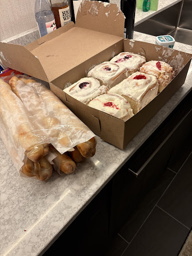 Cinnamon roll Breakfast sandwich Biscuits & gravy 2 coffees