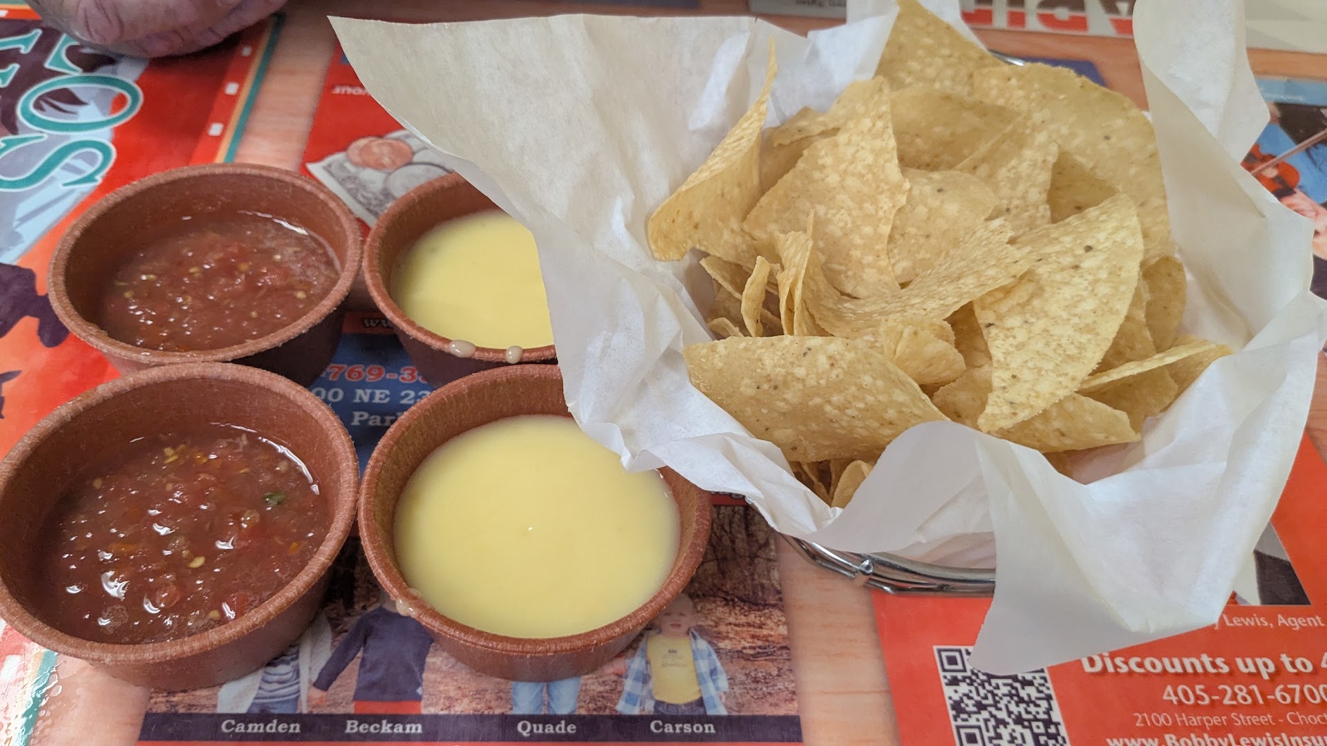 The rice is delicious, I could pass on the beans as they're paler, a bit bland. The cheese is a sauce kind. The salsa is fresh and spicy, love it. The chips are nice and thin so you don't get overly full. The sopapillas are huge and bready.