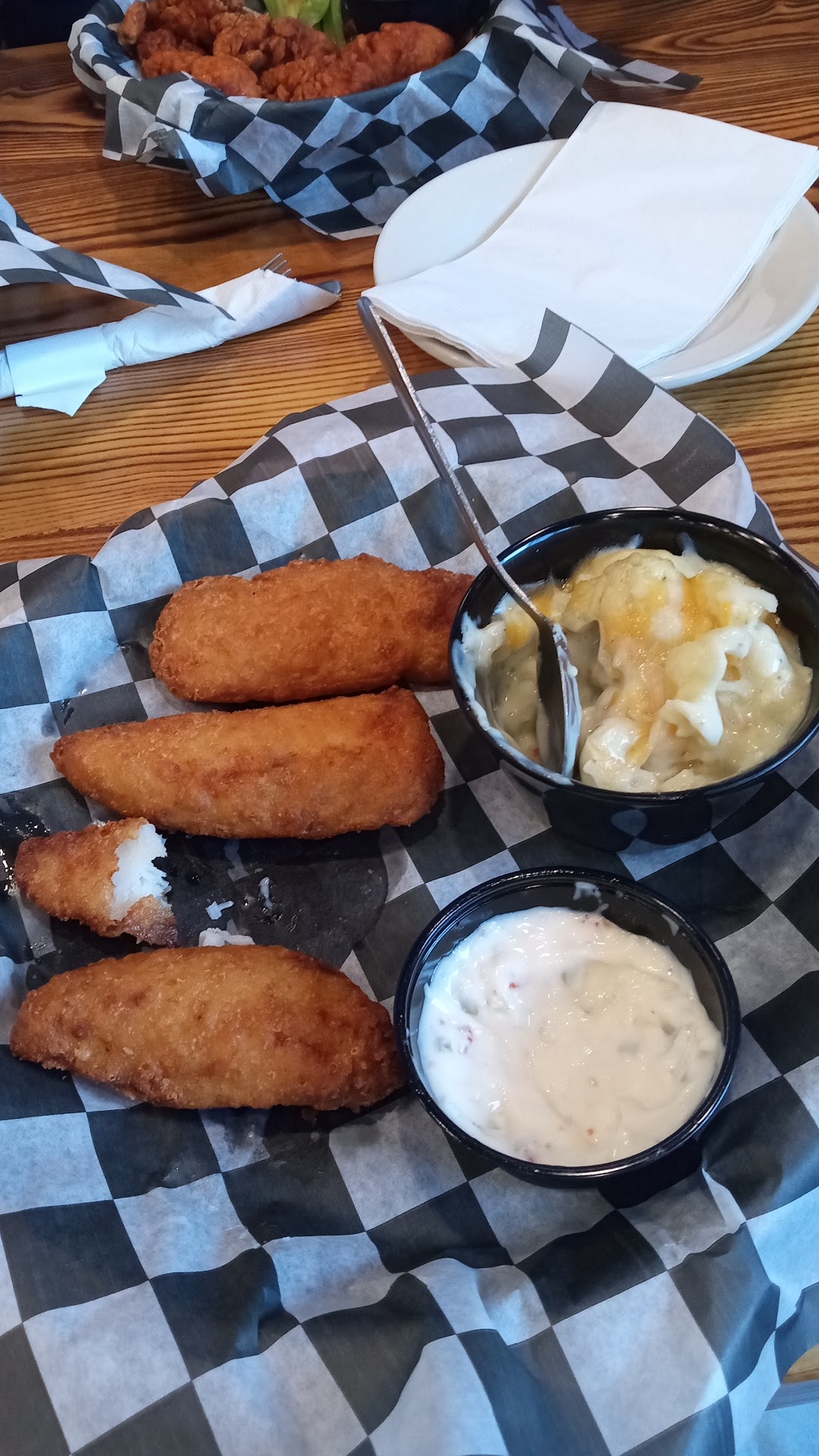 The cheese curds were the same. Huge bite of batter. Cheese? Some pieces had no cheese inside the bite. The sheet had melted outside the crust. And, they were overcooked. No golden brown; dark and over cooked. Sadly, I wondered if the cheese was 1/4 inch cubes.