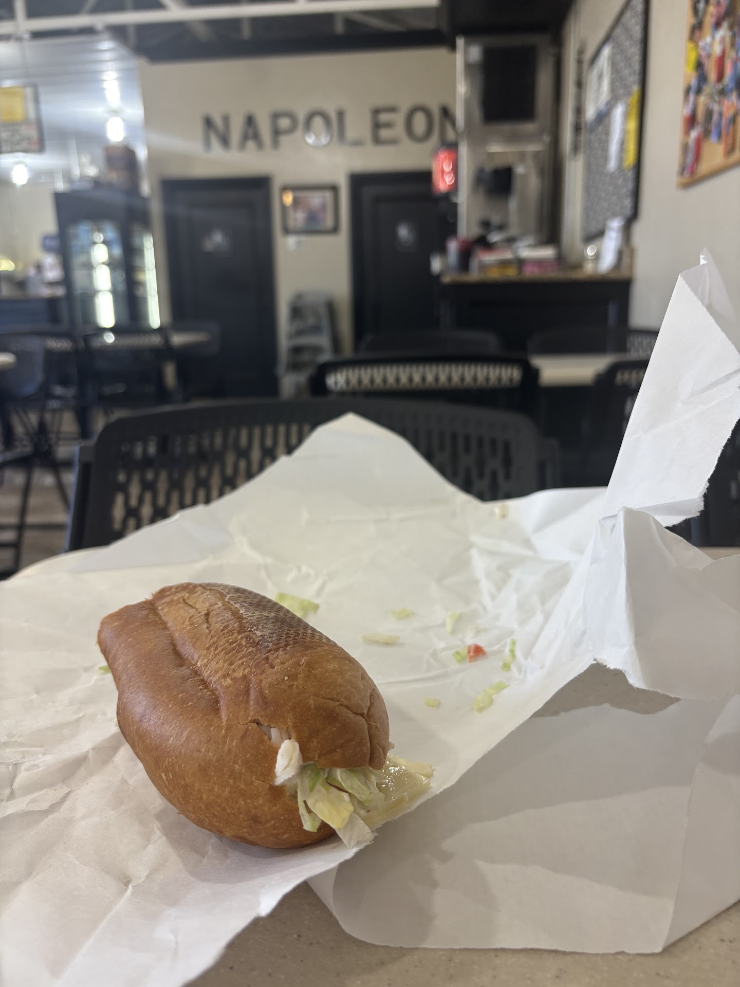 But the ambience was boring and generic: If you ignore the sign saying "Napoleon" and the accompanying poster of the little general (both of which feel out of place in the otherwise "generic - Christian" atmosphere), you might think you were in a particularly cheap dollar store - the chairs and tables are low quality plastic, the walls are mostly white with various Bible quotes strewn about, and the unfinished ceiling and exposed duct work give the impression that you're in a large shed.