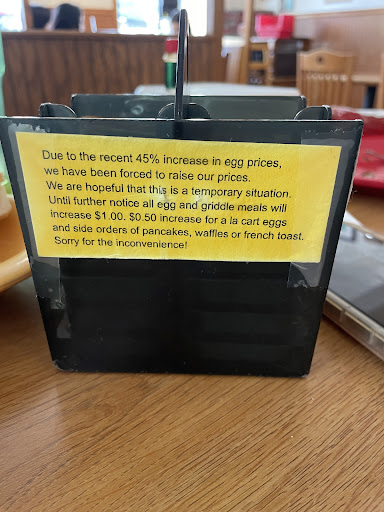 Read moreCame here upon recommendations and also because of the reviews. My kids both ordered omelets. Waitress told us the bread that came with the omelets could be substituted for waffle/pancakes/French toast with no up charge. I ordered a burger with French fries. The burger lacked flavor and the bottom of the bun was soggy. The fries tasted awful. You can tell the oil was old and needed changed. So I didn’t eat anymore of the fries because they tasted so bad. My kids didn’t care for their meals and neither did I. And I can’t believe I’m saying this but honestly I’d rather go to Waffle House or Cracker Barrel. When I got my bill, I was charged for the waffle and pancakes, and the omelets were $2.50 more than what it was listed on the menu. I advised the waitress and she proceeded to show me the little tiny message about the up charge for the cost of eggs that was on the container holding the jelly. (As pictured) Who in the world is going to look at that while ordering their food. THEY NEED TO NOTIFY THE CUSTOMERS WHILE ORDERING!!! Who does that??? The tea was WEAK. The wait for our food was 30-45min. They were busy but not that busy to be waiting that long for our food. I wish I would’ve never came and saved my money or went to First Watch.(First Watch is hands down worth every penny spent) I’ll never return and I’ll be sure to tell others to save their money or...