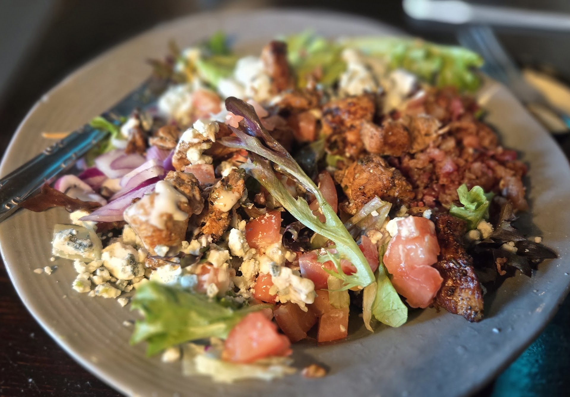 The meal came out in less than 10 minutes, at which time the waitperson said she could bring my salad out when I finished the meal or make it to go... when I declined, a better place would have offered dessert instead since they missed delivering my salad. Nope. Then I realized I had no silverware except the unnecessary steak knife that came with the plate. Staff told me just to grab something from another table. Great service, huh!