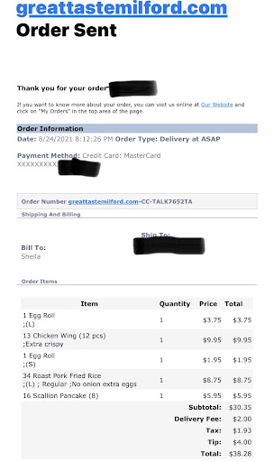 Read moreChicken wings definitely a couple days old dry and hell. The chow main is literally soup. Most of the Dodd were different temperatures one rice cold the other steaming. I ask the guy for my change back and he literally gave me half of what I asked for and split. As a cook myself you should be a shamed cause this food is borderline food poisoning. This review is coming about ten minutes after the drop off. Terrible...