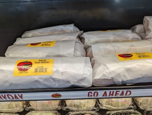 Take-out counter prepping made-to-order Italian sandwiches & other basic fare.