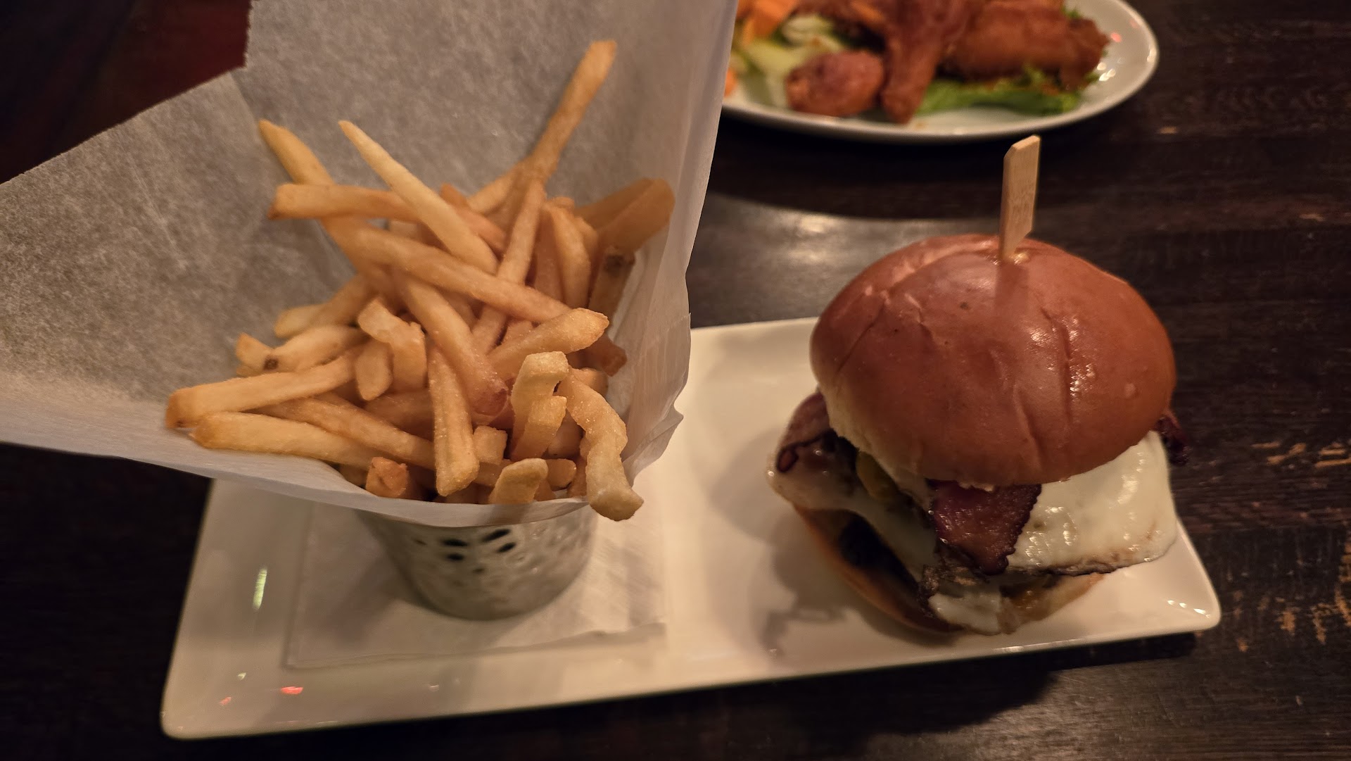 The bar was busy but I was able to get a seat. I was able to get a beer in a timely manner. They don’t have my favorite beer Guinness there but the server recommended a Harpoon dark beer. I can’t remember the name but it was good. I was pleased.