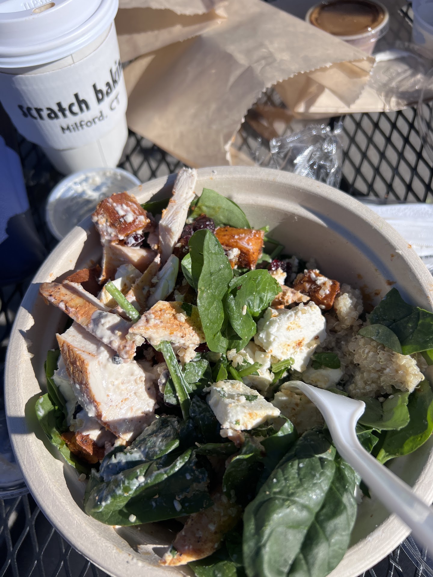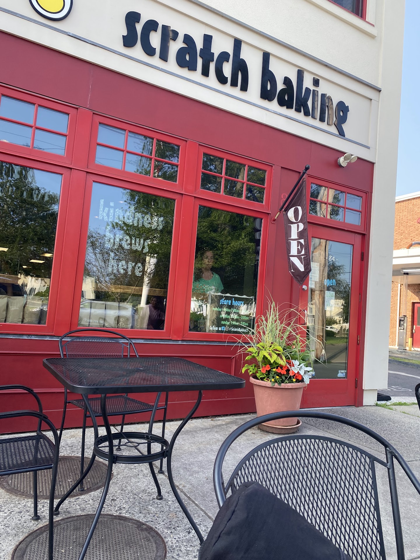 I stopped into Scratch Baking a few weeks ago, to pick up a take-away menu. At the time they did not have any (I was told someone had just taken the last one), but we happened to be in the area a week or so later, and stopped in again, and this time around they had a full supply. The menu looked nice, the baked goods were beautiful, and I loved that you could see the kitchen in action, behind the counter. The cafe was really sweet with 6 small tables inside, and 3 or 4 bar stools up against the windows, as well as outdoor seating. Today, we took our boat into Milford, and arrived at Scratch Baking at 10:45 am. We love supporting small, local business, and I was happy to see the place was bustling! We were greeted by a friendly girl, who promptly told us that they were out of eggs, cheese and bagels. Since at least the eggs seem to be a staple of this business, (and are even part of their logo), we were a little surprised. The menu is small, and an egg and cheese sandwich is the only "hearty" breakfast sandwich (for my husband), so that option was eliminated. He settled for a GIGANTIC orange/cranberry scone, and asked for an orange juice. They do not carry any sort of juice. He then asked for a medium black coffee, but they only offer small and large. I decided on the yogurt/granola parfait, along with a small tea. Our bill came to about $14.00. There is a self-serve station with a large glass jug of water (as it was super hot today, having ice in the water would have been nice), as well as utensils, milk, Half & Half, etc. We were able to find a seat inside, and I have to say, the food was delicious. The scone was really good - not too sweet, and easily could have fed 3 people. The yogurt with homemade granola and fresh fruit was light and healthy. I actually had quite a bit of the granola left over, and took it home to enjoy on its own. Having never been to the previous location on River Street, I cannot comment on how the business was run, and hope that at its new location, they still are trying to get the kinks out, and are hopefully busier than they ever anticipated! :) As the menu is somewhat limited, when you run out of not one, but three items, to me, that can signal a potential problem. We actually saw one couple leave, when told there were no eggs, cheese or bagels. We think juice also goes hand in hand with breakfast, and offering some bottled juices would go a long way in providing a better dining experience. We will absolutely go back, and hope by then things will be running smoothly, and they will have a better handle on their inventory, and perhaps will even consider expanding the menu a bit to provide more options for...