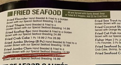 She comes back and puts a plate of clam strips in front of me. I asked my husband to talk to her and she tells him that all clam meals are clam strips. I’d believe that if the clam strip basket didn’t come with French fries. The jumbo fried clam comes with bread, sides, and soup/salad. I got my sides and soup as ordered. I don’t understand why I wasn’t told after having my order wrong three times but when my husband says something, there’s an explanation.