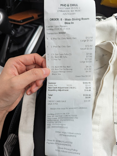 The server gave my pescatorian friend a beef banh mi (and of course my friend did not order that). My friend tried to order milk tea, but the server kept saying he'd come get the order later. We had to ask a few times to just order one drink and wait another 30 minutes or more. The whole process took nearly an hour, and my friend got green tea instead of milk tea. At that point, we knew how slow the girl was and did not want to wait another hour, so we gave up. One of our food orders came way later than others. I don't know if they forgot about it or if they were just so slow. It wasn't even something complicated. Watch out if you come here with a group. We split the bill, and somehow my bill came out way more than I expected. I asked if I could check what was in my bill and if he accidentally added my friend's drink. He insisted that I could not check what's on my bill on the screen since it only shows full order and my bill is correct. I was skeptical but paid anyway with a 15% tip. I ended up finding out that there were "non-cash adjustment 18%" and "rounding adjustment." Both the server and the menu did not mention this at all. No wonder my bill was higher. Since they don't even take cash here, the 18% must be a group charge (we had 7 people), but he should have told me. Honestly, I did not even want to pay a 15% tip for the awful service, but I paid anyway. The server did not even check in, and there were no water refills the whole time. If I knew they already charged 18%, I wouldn't have paid an extra 15%. We all felt like we got scammed, and we will not come back...