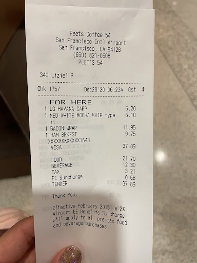 Read morePeet's Coffee in San Francisco International Airport's Terminal 3 was not the most pleasant stop during my travels. While Peet's isn't usually my first choice for coffee or tea, it was the only option in the terminal, so I decided to give it a try. Unfortunately, my experience fell short of expectations. I ordered a black coffee, a green tea, and apple turnovers, but only the black coffee was correct. My green tea turned out to be some sort of berry tea, and instead of turnovers, I was handed donuts.