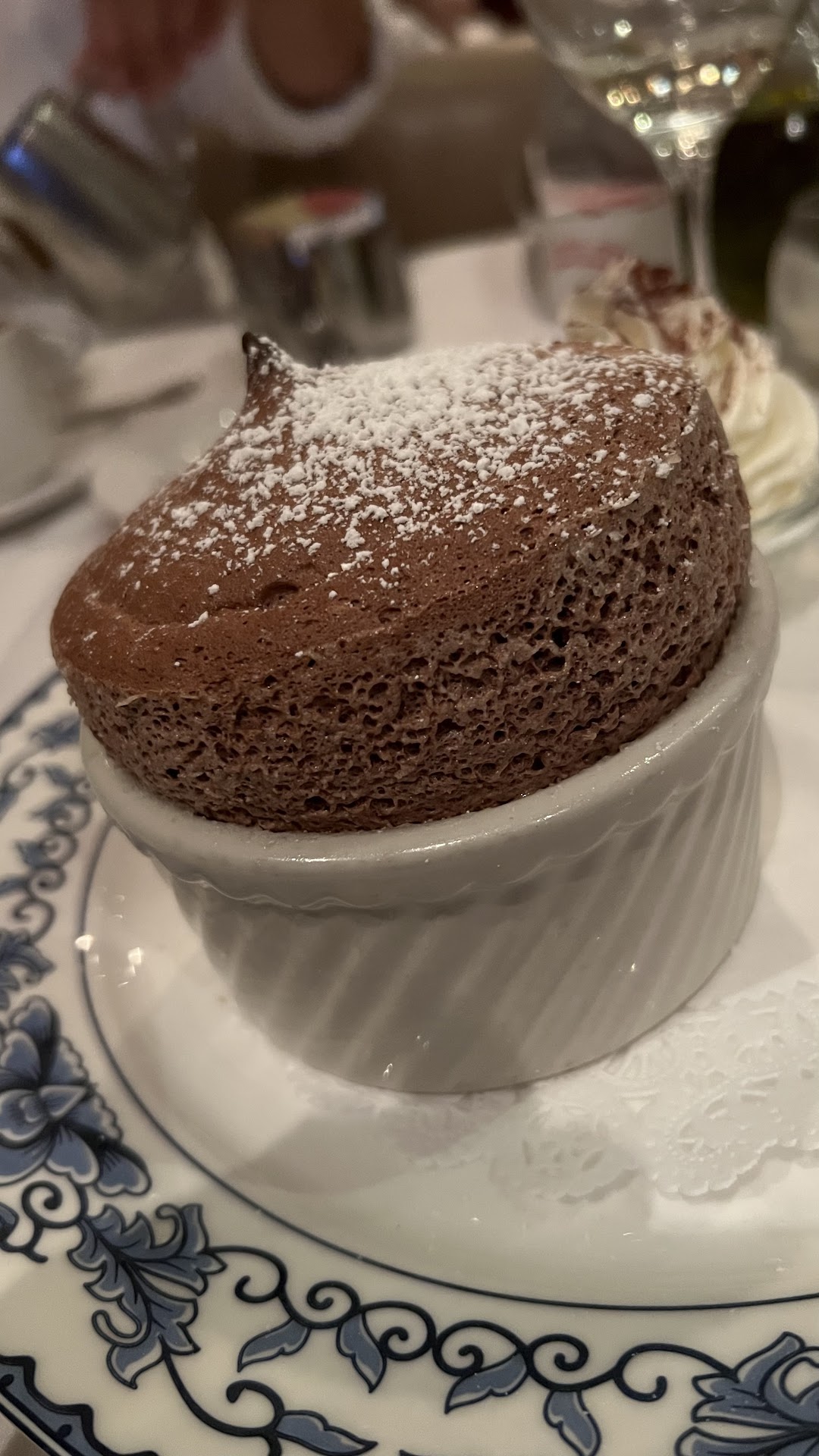 Now for the food… Appetizer: calamari was flavorless and the marinara sauce just tasted like tomato sauce. Caesar salad was edible. Wine: I was surprised when the waiter told us that they only serve half bottles or full. Half bottle selection was limited so I couldn’t order what I really wanted to drink. Main course: I ordered the sole special ($40). The fish was over cooked and the flavor was nonexistent. I couldn’t taste the garlic (which was the reason I ordered it). My daughter ordered the Fusilli con Cavolo ($25) and that had more flavor, but was too salty. Dessert: Tartufo Trio was the best thing that we ate here! I also ordered the chocolate soufflé and that was just ok. It had a side of whip when it really needed a side of chocolate ganache to give it more flavor.