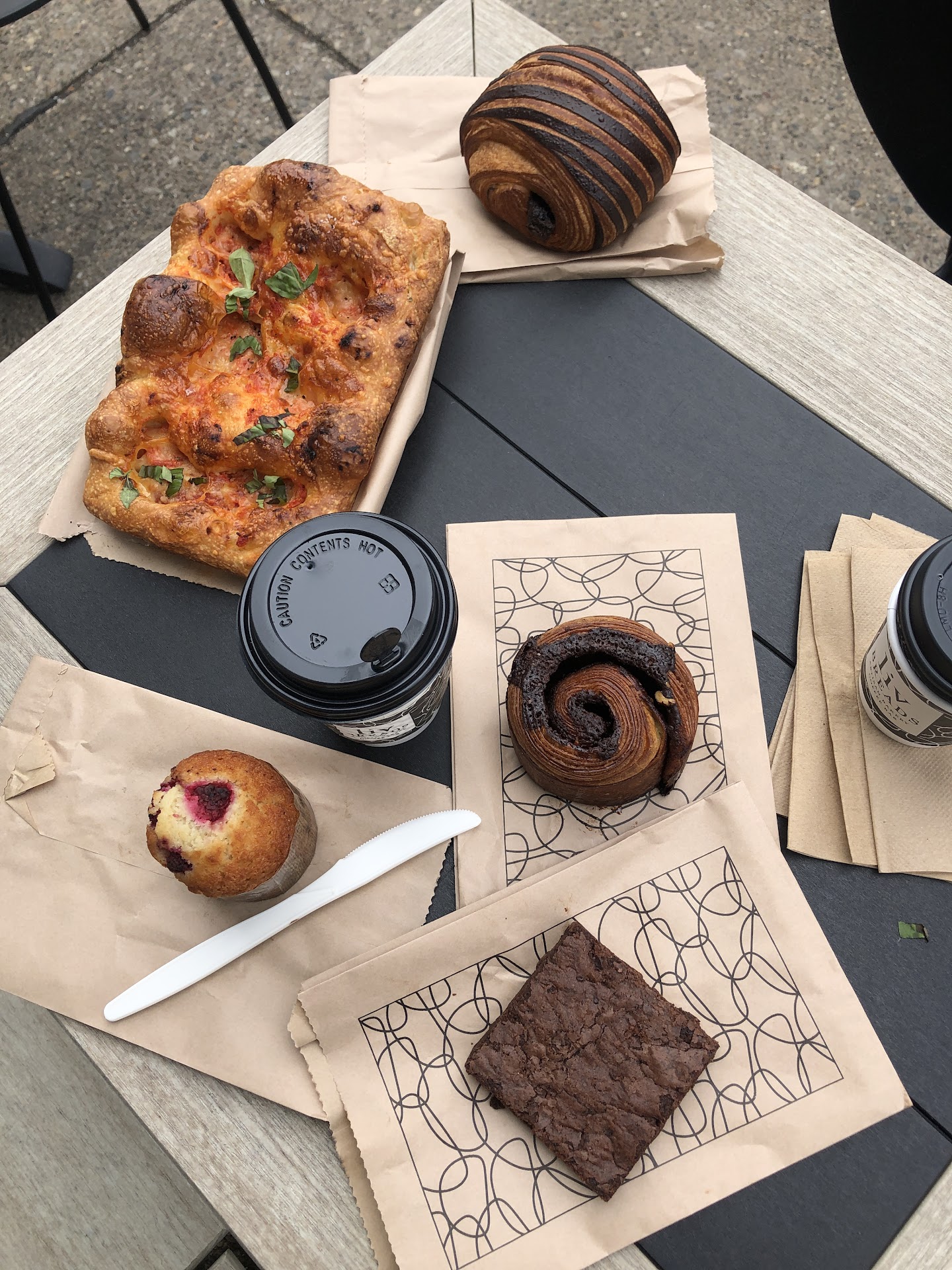 The sourdough bread is phenomenal. The babka, chocolate rugelach and fruit turnovers are perfect to pair with a cup of coffee. (I’ve bought their Counter Culture beans myself but can never quite replicate these awesome lattes at home). They often put “treats” — tiny bites of their pastries — atop the coffee cup lids.