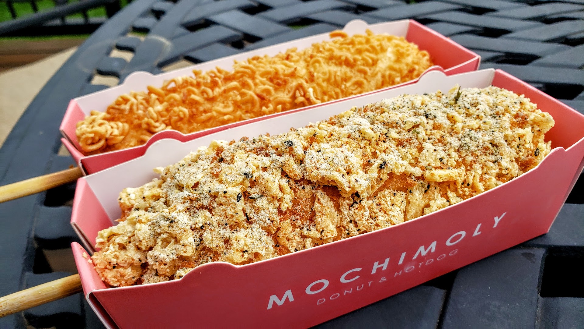 Holy Mochimoly! Mochimoly offers mochi donuts, boba tea, and Korean mochi-encrusted hotdogs which are their best item. Their hotdogs which are kinda like corndogs on roids come huge with 4 sausage options of Beef, Spicy Beef, Cheese, and Spicy Cheese with toppings choices of Ramen, Cheetos, and Truffle/Garlic/Parm. I really enjoyed their spicy beef hot dog with truffle/garlic/parm which was super tasty and filling. Then while their mochi donuts were very pretty with deep flavors (e.g. matcha, coffee, black sesame, nutella, blueberry, taro, churro, strawberry, and plenty more), they were a little too dense and sweet and the outside wasn't crunchy which might have been a timing thing and worth another try. I'll definitely be back for their hotdogs.
