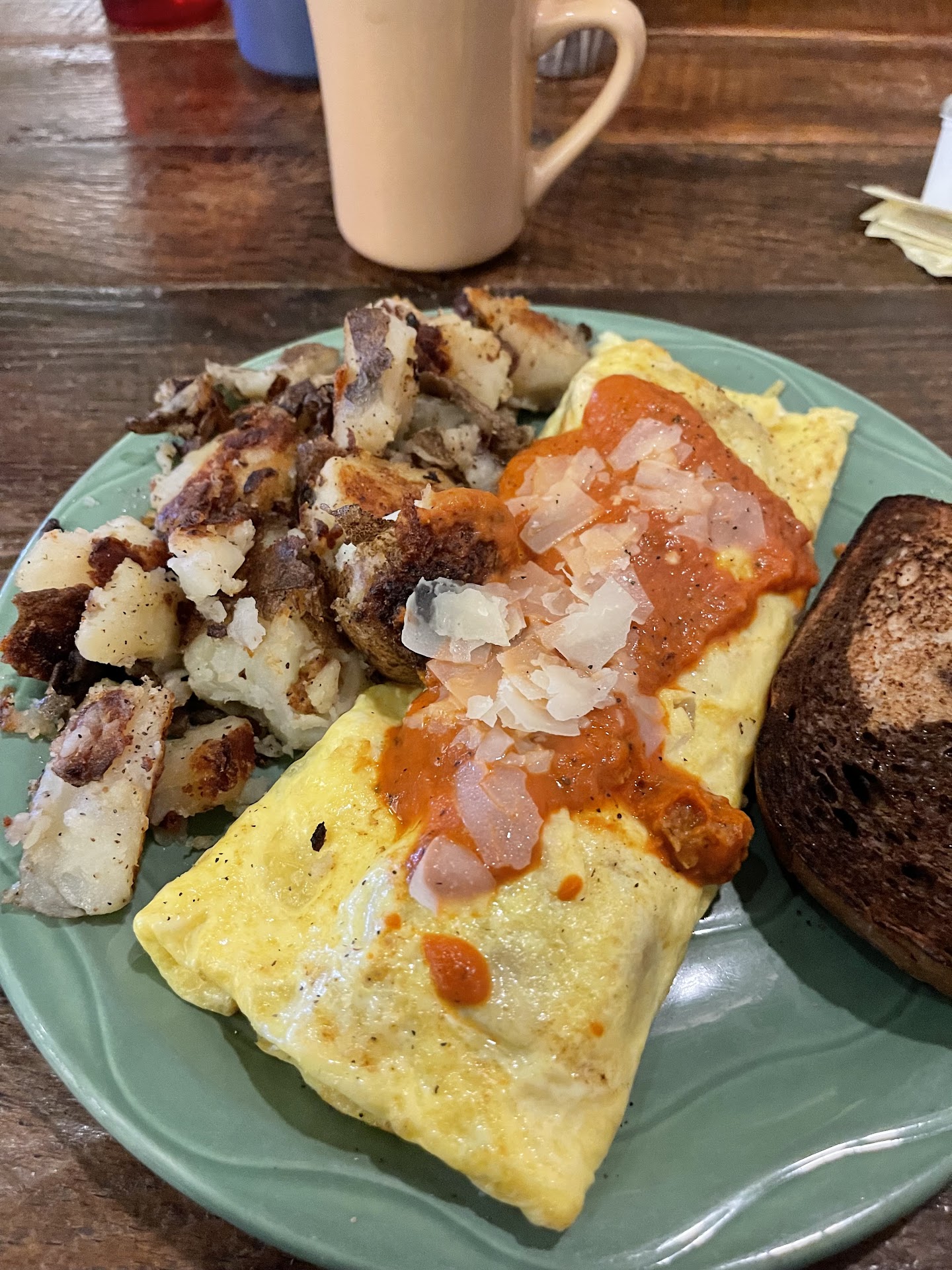 And the food? A touchdown every time. Their pancakes are the size of the steering wheel in my Subaru. The French toast? Pure magic. And then there’s my wife’s favorite, the cheeseburger omelet, which is basically breakfast and lunch in one glorious, cheese burger filled bite. Why choose between two meals when you can have both at the same time?
