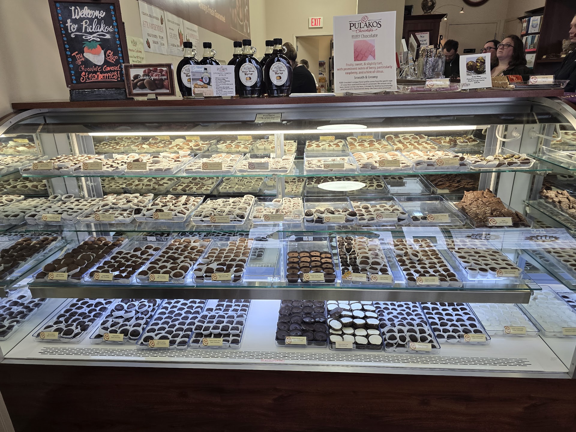 Pulakos have the best chocolate ever. I have been all over and have never come across a chocolate like here. My favorite is the milk chocolate. It is south, perfectly sweet with just a dark or semisweet undertone that goes perfectly, it gets creamier the longer it melts but does not become over-powerfully sweet. With other local as well as local chocolates any place I've been thought the country, the creamy texture lingers leaving such a sweet rate that I can only eat 1-2 pieces. With Pulakos, I can keep eating because of its prefect balance of the sweetness levels and balances. If I'm looking at some different candies to see what I and too have boxed up and cannot decide, I have always been given a sample if I needed one. Wash of the chocolates are had finished to put what each one is with different zigzag and swirl patterns. The pectin jelly beans are terrific and their gummies are the best texture, flavored as you...
