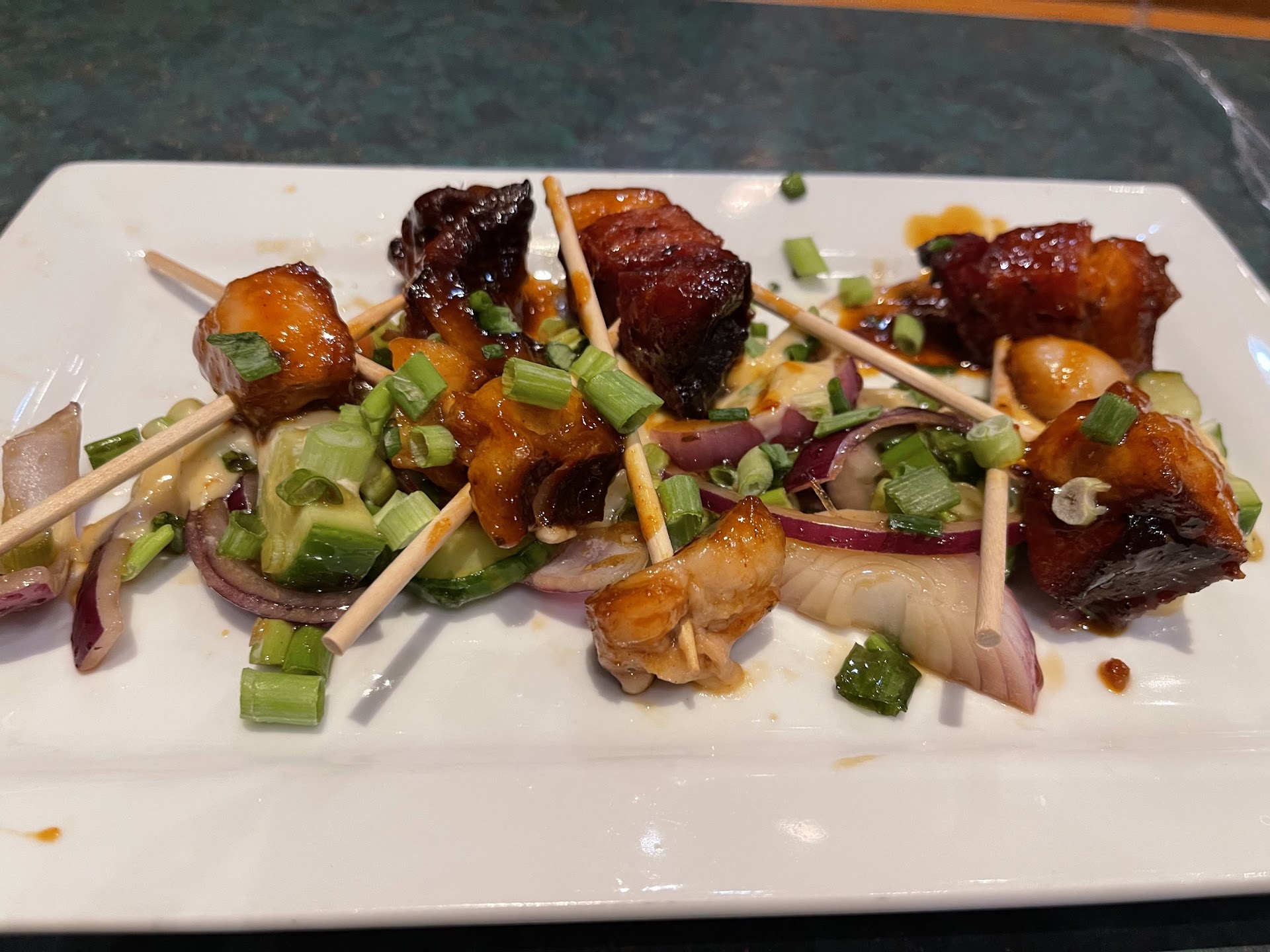 Food 3.5/5: Started with the pork belly pops. Donât recommend it. Very sour and very fatty. Maybe only half an inch of meat and the rest was fat. Wifey ordered brisket platter. It was very tender and juicy but the rub was a bit on the salty side but it was still delicious. I ordered boneless rib eye. Asked for mediumâs rare got medium to medium well on the half of the steak. So that ruined it for me. Ordered a side of loaded mashed potatoes. To me the mashed seems like it was out of the box. Didnât taste like real potatoes, had the wife taste and she said the texture was off as well. As for the price its a little bit on the high side for what they serve you. The portions seem small for what you pay.
