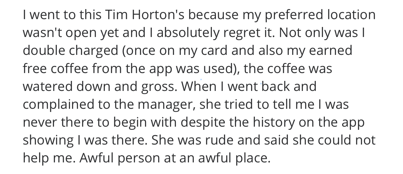 Read moreLast 5 times I've been there you guys are to busy talking to one another about personal things, loudly I must add. Then you screw up my orders. Over fill my drink. An egg breakfast was a hasbrown and sausage breakfast ICE COLD.. My biscuit sandwichs was English muffin 2x on two separate occasions and only thing warm and that was the hashbrowns and the coffee. The hashbrowns on the 1st order were like bricks you couldn't chew them. So I spend almost $20 each time. You guys lost a customer that pays one of your paychecks, cause your not paying attention and to busy talking and what ever else your doing. There is other Tim Hortons in the area that pay attention to details. That's where your business is going to be headed if it hasn't already, because I am sure I am not the only person this has been happening too. So get...