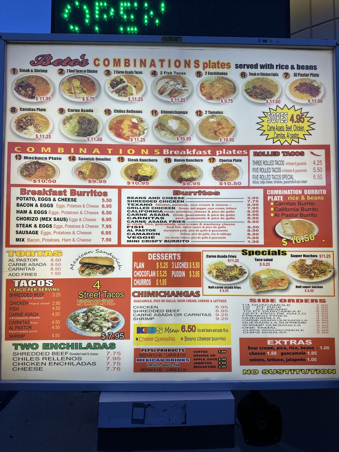 I unfortunately stopped in here for dinner last night...I was immediately shocked that a burrito I wanted to try was 1409..:so I opted for my usual carne asada fries that are usually around 12 to 13 bucks at most betos..but here surprise surprise there 1409..so reluctantly I ordered them even though the lady taking my order looked as if she was taking the order of her absolute enemy...so I paid with 15 dollars and 10 cents .and the lady says ok have a nice day. As someone would say if you paid with exact change...I was going to leave the dollar for a tip.. Even though it definitely wasn't earned in any way shape or form..I could go on and on about her lack of customer service but will just leave it at she either doesn't posses customer service skills or wasn't about to show me any she did posses ..but the fact that you just expect me to tip and where basically telling me you weren't going to give me my change really got my goat . So I stood there until she gave me my change...then I here her switch to Spanish and start addressing the cook ..and the both have a good row of laughter I assume was at my expense.. however I can't be sure because I don't speak Spanish...wich I'm thinking I should learn so I'm able to react accordingly if such situations arise..anyways I get my food and my fry's are the big thick fry's not the shoestrings like advertised and all betos use .and serverly old or severely undercooked.. so I basically spent 1409 on a plate of food I could not eat... And that betos has forever lost a customer.. because I work to hard for my money to just give it to rude false advertising companies that don't care one bit about there customers that are the only reason they have a restaurant in the first place..and I strongly suggest to anyone thinking of eating there to not do if...on 900 south state is a taco stand that sells huge delicious burritos for 9 dollars and the guys that run it are awesome,friendly, respectful...and really care about there customers...and the food is 10 times better. I eat there all the time and never once has it been nothing but 10s across the board ..in fact I'm there right now after my awful meal last night...an awesome burrito is in order.. I strongly suggest you try that taco stand over this...