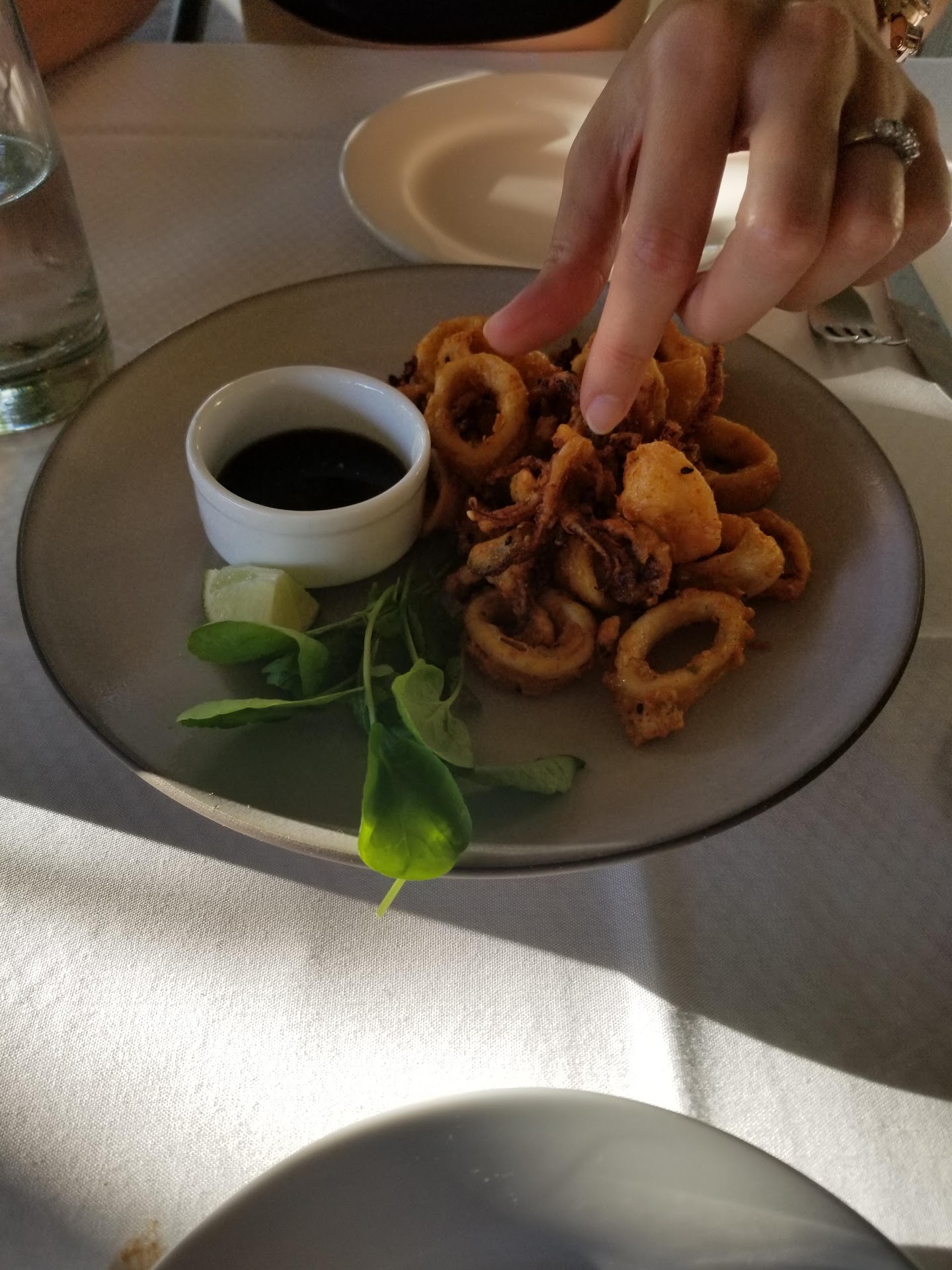 We had the grilled peaches, duck rolls, calamari, and rabbit pappardelle, with the chocolate cake for dessert.