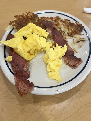 Read moreThe five stars is not for the food; pretty much every one of the hundreds of these pancake houses that dot the generic, frontage-road Anywhere, America strip mall landscape is the same except for the regional accents that can be overheard floating up from the packed booths that characterize this quantity-driven all-you-can-eat pancakes and "bottomless coffee pot" breakfast giant. What set this location apart was the extreme cleanliness of the place at all hours and the genuine friendliness of the staff. When my friend realized she had left her (very costly) mouthguard wrapped up in a paper napkin amongst the post-meal wreckage of our T-Rex sized plates of eggs, bacon and (of course) short stacks on the side, we did a stunt-driver U-turn on the traffic-clogged highway to sprint in and try to find it on the table before the server had cleaned our table off. When I ran back in (my friend sat in the running car, panicking over what would come next if the removable splint that held her broken jaw in place until she could have surgery was gone) to find our table already cleared and wiped down, the manager grabbed every single server and kitchen worker so that every single pony-sized trash can in the place could be torn apart, bit by bit, until the costly mouthpiece was found and sanitized so my friend would not have to spend several thousand dollars on an emergency replacement. It took twenty minutes (which felt like two weeks) but the amazing manager and willing crew did not stop until the dental piece was found...and they sanitized it thoroughly for my friend then APOLOGIZED for cleaning the table "too fast" and offered us free cups of coffee to go for inconveniencing us. What??? I tried to give the search party twenty bucks each for giving us unheard-of customer service, but each person refused the tip, saying it was "the least they could do," and it was clear they meant it. I don't know what made us feel better-the soul warming kindness of the crew or the excellent coffee we took with us. I'm going to go with both. I never take for granted that sometimes true human generosity CAN come with a...