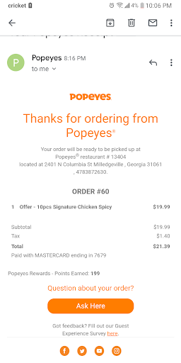 Read moreI went to Popeye's today on October 10th 20/20 at about 5:18 pm. My order that I placed through drive-thru is $40.40 after sitting at the drive- thus watching an employee pass out candy. I was asked to pull up because they had to cook chicken. After sitting there more than 20 minutes and employee came out stating that it would be an additional 15 minutes because the chicken had just been dropped. I asked for a refund so the employee took my card inside and I sat there another 5 to 6 minutes waiting for her to return. After the employee had not returned with my card I got out and went inside to find out what was going on. The employee faded they was having trouble refunding my money they eventually did a refund to my car for only $25 and some change instead of the original $40.40. I was given $14.61 in cash which would bring the total to $0.10 short or the total amount that was originally charged my card. There was cars wrapped around the building waiting to place orders at the drive-thru. The service today was very...