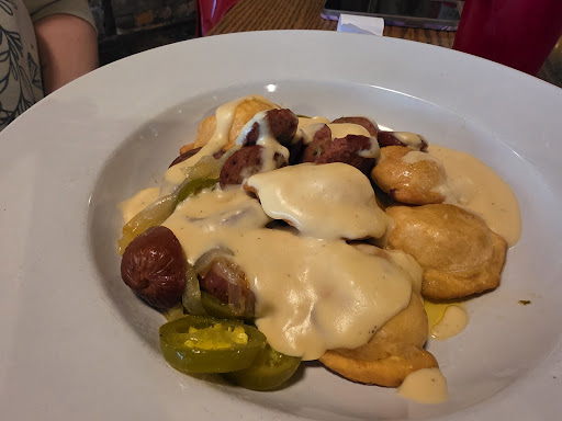 Ended up getting the black bean burger (Black bean burger topped with red pepper aioli, served with cheese, and lettuce, tomato, onion and pickles) with fries and the Banger bowl (burnt end brisket brats served with pierogies, topped with beer cheese, caramelized onions, warm butter sauce & jalapeños). The waitress questioned the black bean burger and kept asking what I wanted on it and was confused when I listed the menu description.