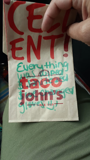 Read moreThis Taco Johns has really gone downhill the last couple years. Everytime I get potato oles they are nasty. Like overcooked and the grease they cook them in tastes old and stale. My wife ended up with food poisoning from here tonight as well. The people working in the back were LITERALLY seen taking dabs ( smoking pot ) in the kitchen from the drive up window. This place needs a health inspection and some drug testing on...