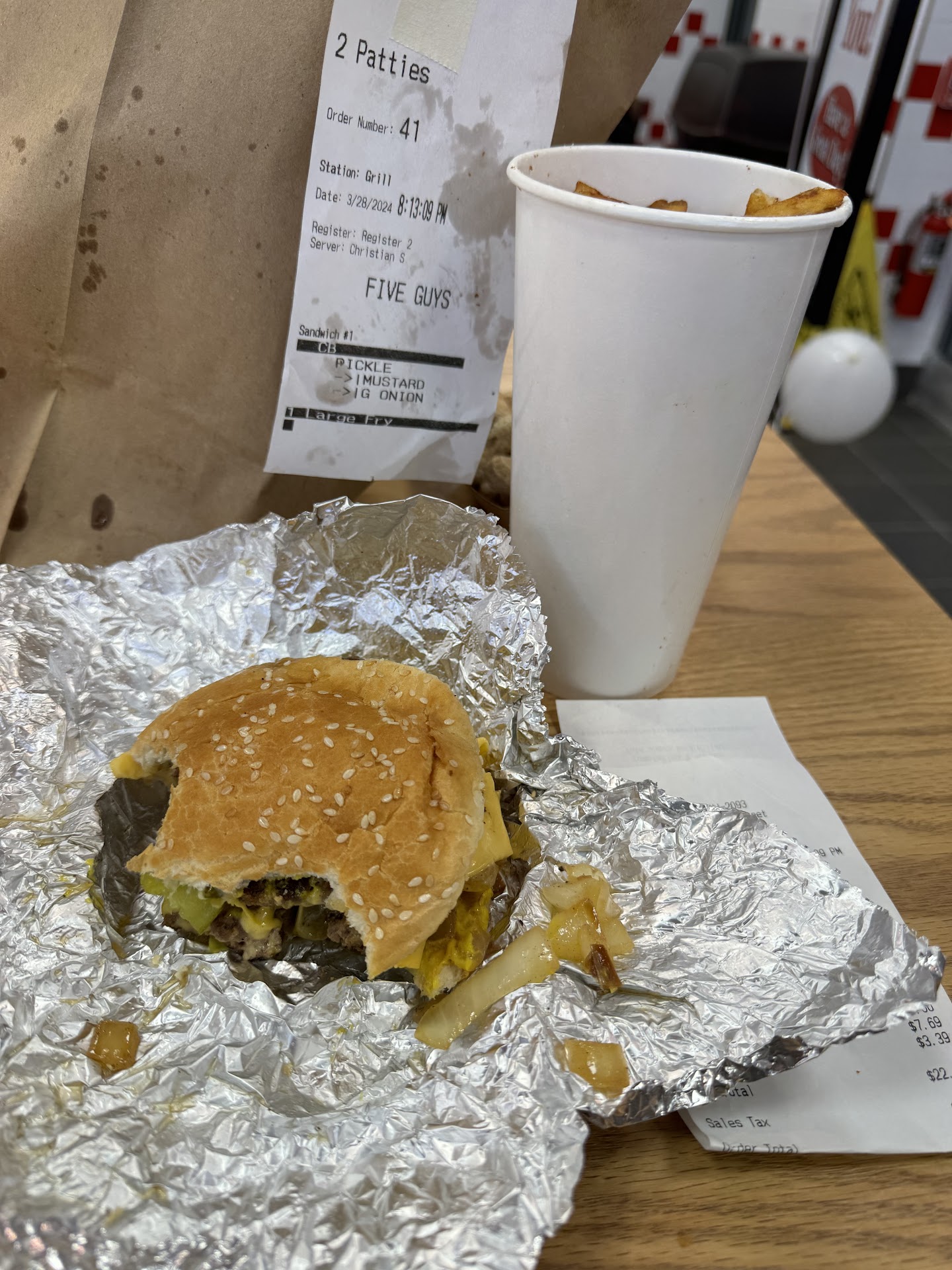 Read moreFirst time eating at 5 Guys. Walking into the restaurant, they greet you right away. That was a plus. I told the guy it was my first time he explained the menu to me, that was really nice. The bathroom was nice and clean. Loved the peanut box at the entrance. Took the food to go. When I got home and opened the bag, it was FULL of extra fries. I ordered my burger 1 patty wrapped in lettuce no bun so I can try. As soon I bite into it, I can taste the WELL SEASONED patty. DELICIOUS. Fries are great also, but I couldn't finish them. Had a leftover bowl. It was a special occasion, so I didn't mind spending almost $30 for 2 burgers and one order of fries. That would be something I would only do on special occasions. Holly expensive. lol. Overall, the food was great, and the staff...