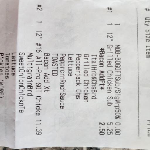 Read moreWe purchased 6 sandwiches about a week ago and didn't realize till getting home that the amount of meat and cheese was less than what we've normally received from other Subway shops. The meatball sub was OK but the other 5 sandwiches had minimal meat on them. Also, reading some of the other reviews leaves me suspect about who may have been encouraged to write them - they are all rating the shop consistently highest. That could be a coincidence...