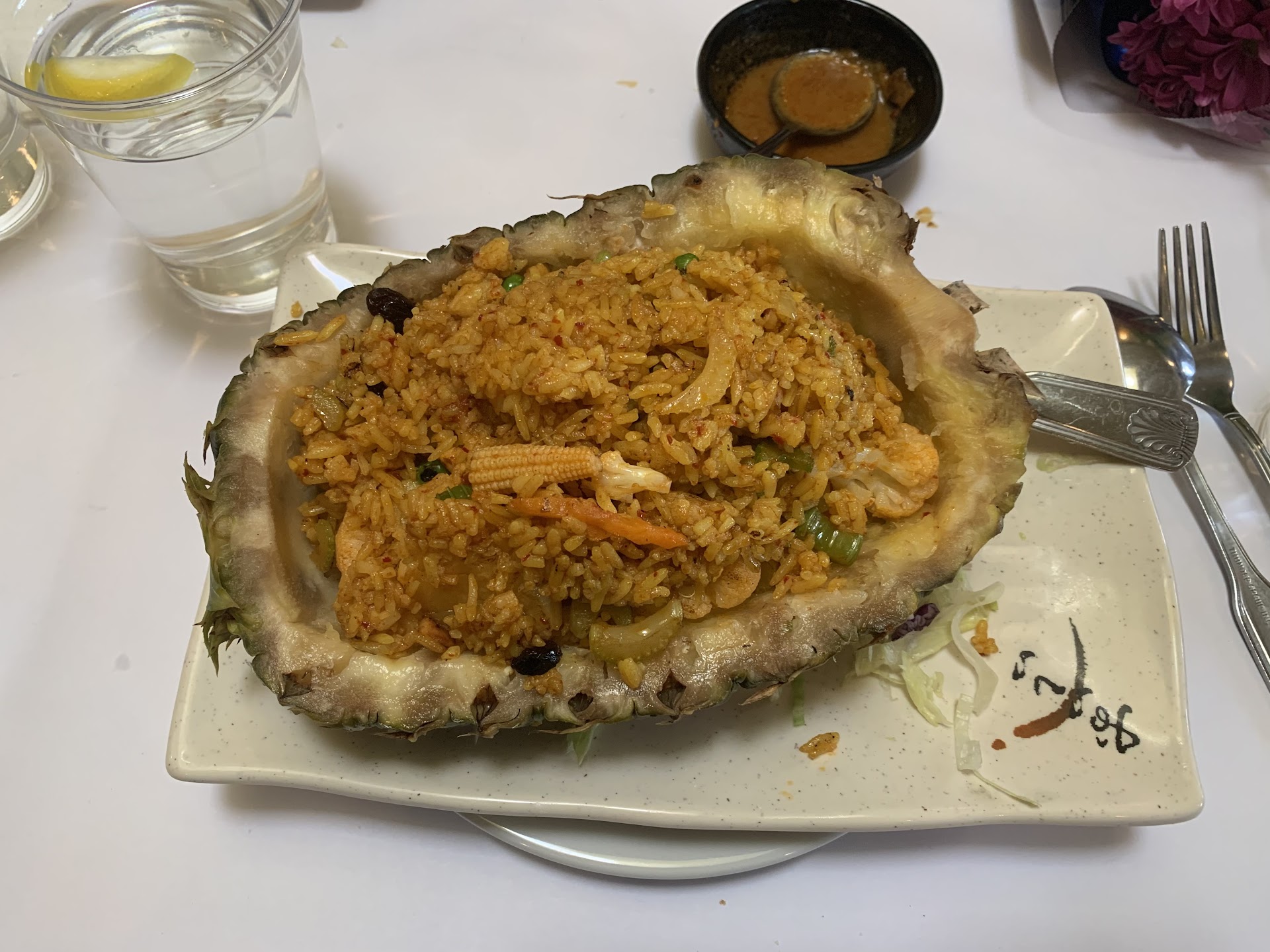Read moreWent to this place for lunch with colleagues on Friday afternoon. We've dined out a few times in different places in the recent past once the restrictions were relaxed. However, this was the first time stepping into a fully packed restaurant since the pandemic started and we were awestruck at the attendance. We were thankful to our colleague who had reserved a table for us. Every single table inside and in the patio was taken and there were 10-12 people waiting for a table too. Clearly, operating at full capacity has its challenges. We were seated and provided water but then no waitstaff checked on us in the next 15 mins that followed. You have to scan a QR code on the table using your phone and that takes you to their menu. But you can pick/order your dish there as it is just a PDF document. This was a hassle but the alternative would have been to wipe/sanitize every menu handed over or to use menu printed on standard paper, dispose them every time. We had to call the waitstaff to take our order. The dishes started arriving about 10-12 mins of having placed the order. The options are diverse, a lot of vegetarian options too. The Roti prata was alright, I found the Roti on the sweet side and absolutely nothing noteworthy in the curry sauce. The pineapple fried rice too was just “ok”, nothing compared to the ones you get in a proper Thai eatery. The chili paste in the fried rice was not fully mixed and there were clunks of rice and paste. Not many veggies in the Vegetarian version either, except for some pretty big pieces if cauliflower which wasn’t even cooked properly. Broccoli sautéed in the fried rice would have been perfectly fine semi-raw, with a crunch, but not cauliflower. Pad See Ew was nice but Pad Thai, not so much. A lot of tables started becoming available around 2pm. It took ~10 mins to get the bill and another 5 mins to clear it. Struggling to come to terms with so many 4+ star ratings...
