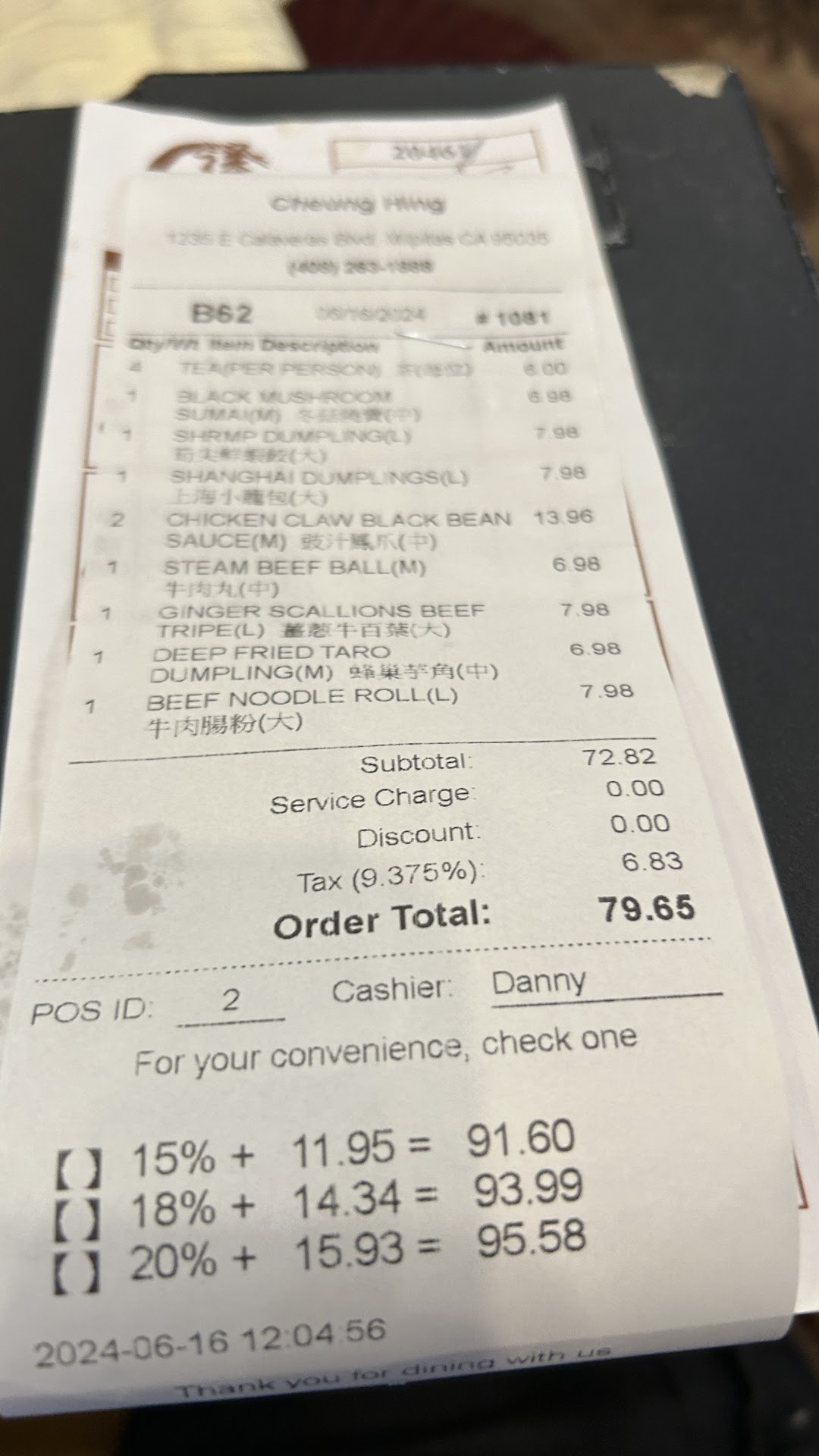 Itâs fatherâs day and my family wanted to take me to a different dimsum restaurant, so we went to this establishment in Milpitas, about 17 miles from our home. Itâs in a shopping center with limited parking spaces due to many businesses. Luckily we found a parking spot. Lots of people were waiting outside but we got to sit right away, may be itâs only 4. The table was quite small, typically for 4. The place is big and I noticed there were no dimsum carts. The service wasnât very good because one server was running with many tables. Anyhow, we still got our ice water (without ice) and our tea. We had to mark what we wanted on the menu with a pen. After that we gave to our server and he printed out an order stapled to the menu. Now, if you have a lot of time, you may like this place because every dish is trickling to your table every 5-10 minutes. We ate and waited for the next one. So for us itâs a total turn off. The food is not bad although the portions are bigger than our favorite Harbor Bay Village Seafood in Newark, but we still prefer our favorite place. Every dishes are tasty except for the tripes were tasteless. My daughter favorite dish and she only had one bite. I had to finish it because we donât waste food and itâs not nice to return it. The prices are comparable to other restaurants so nothing to say here. The service and food delivery were subpar. We got 2 of the same dish delivered and one was taken off because of their mistake, all in Chinese so we canât see which one is which until the all the names on our order was crossed out then we realized our last order was replaced by the duplicates. Will we come back here again? The logic is why would we drive 17 miles to have ok food, ok prices, not ok services while our favorite place is 3 miles from home. The answer is NO although my kids like the...